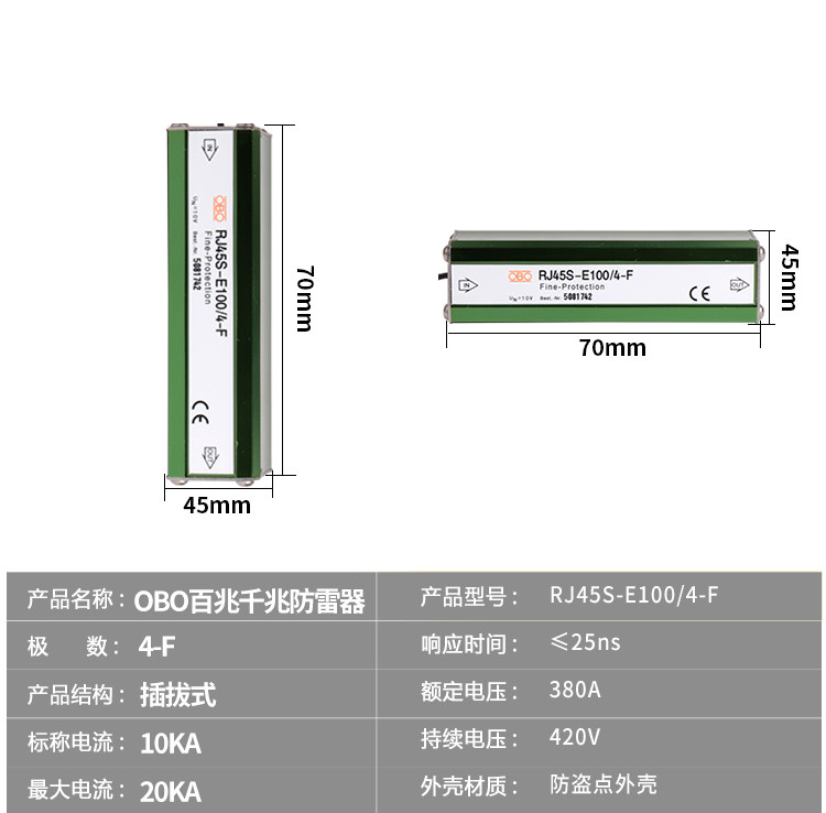 German OBO 100M gigabit network lightning protection device RJ45S E100 4 F telephone lightning arrester