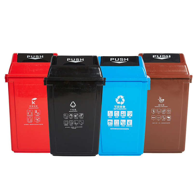 Wine red 20 litres thickened with covered red (harmful garbage) 20 litres thickened covered blue (recyclable) 20 litres thickened covered black (dry litter) 20 liters thickened covered coffee colour (wet litter)