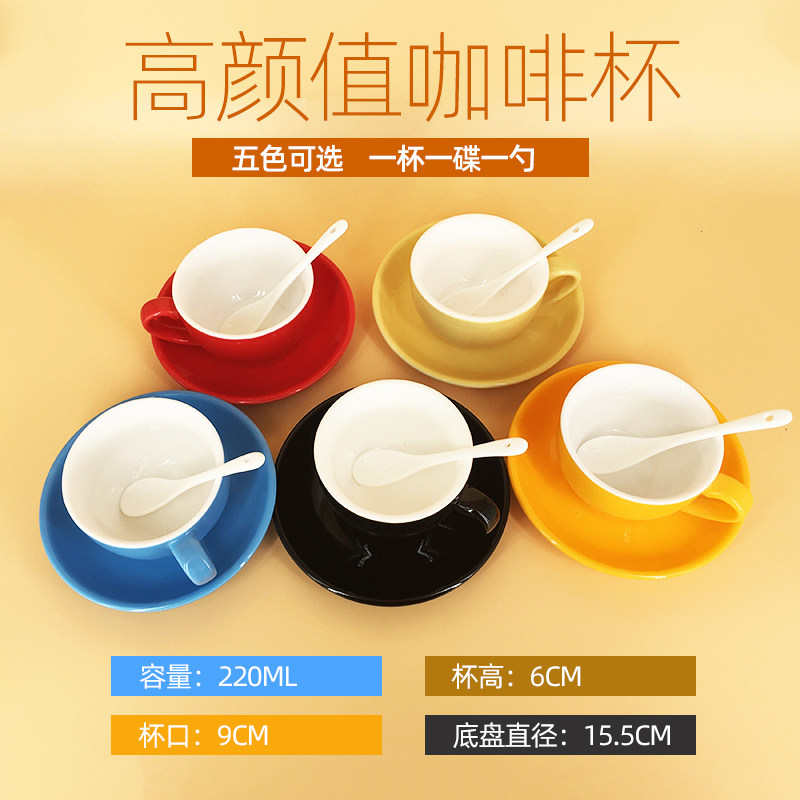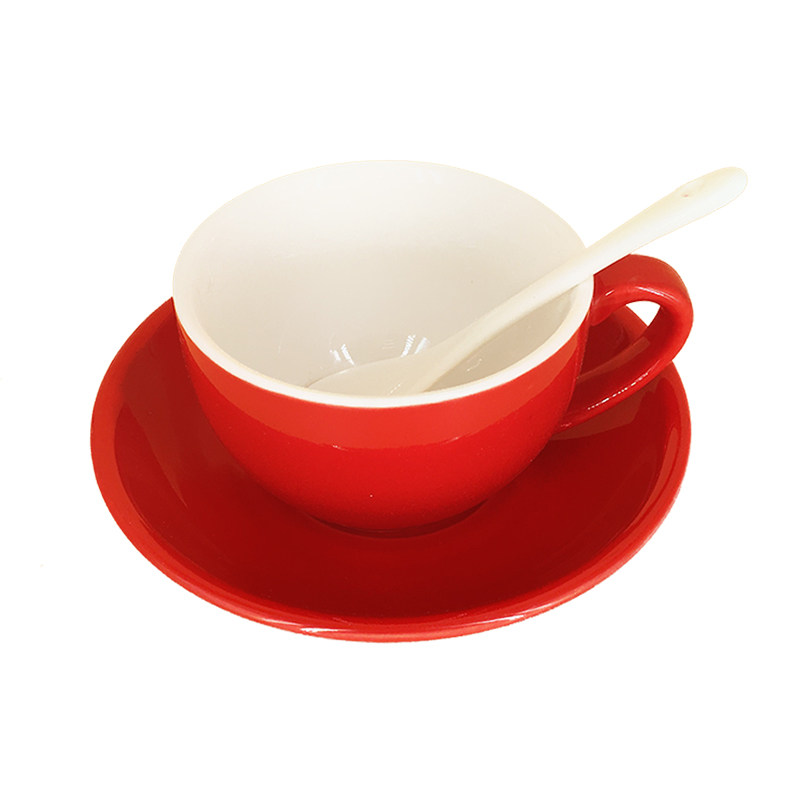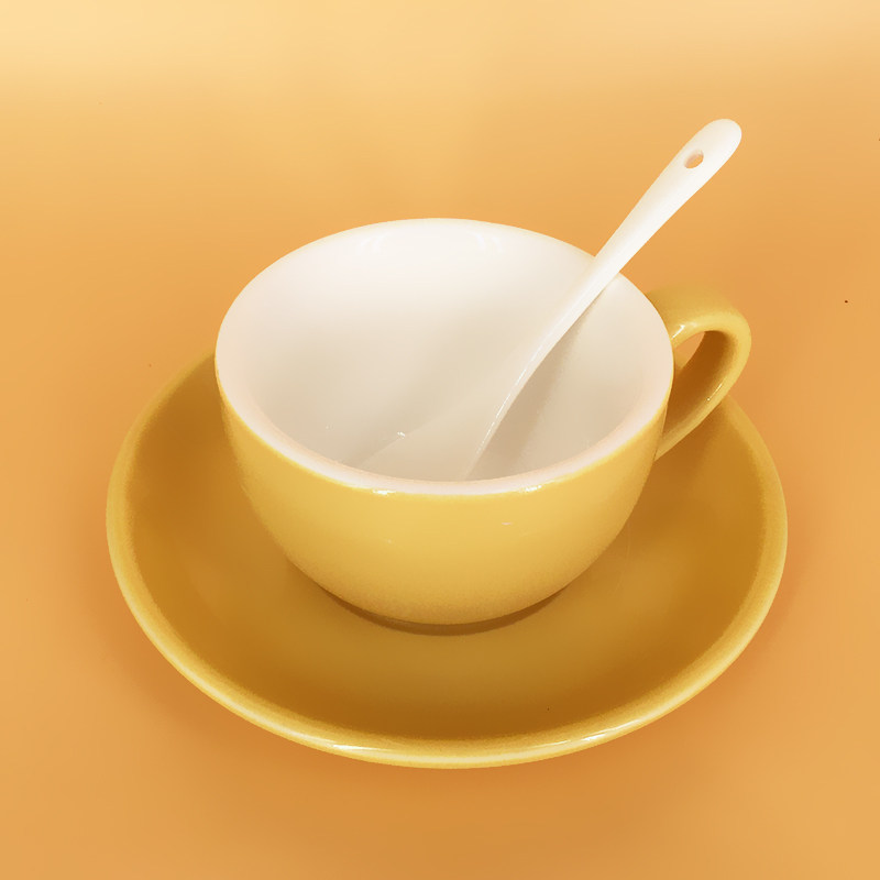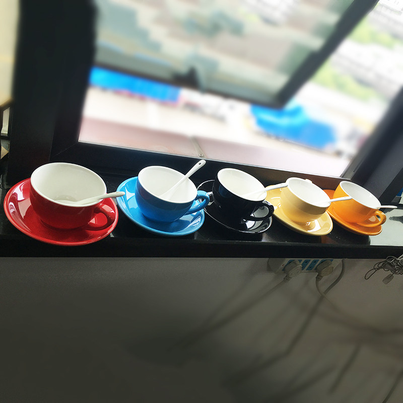 Red (one cup, one plate, one spoon) sky blue (one cup, one plate, one spoon) black (one cup, one plate, one spoon) orange (one cup, one plate, one spoon) goose yellow (one cup, one plate, one spoon)