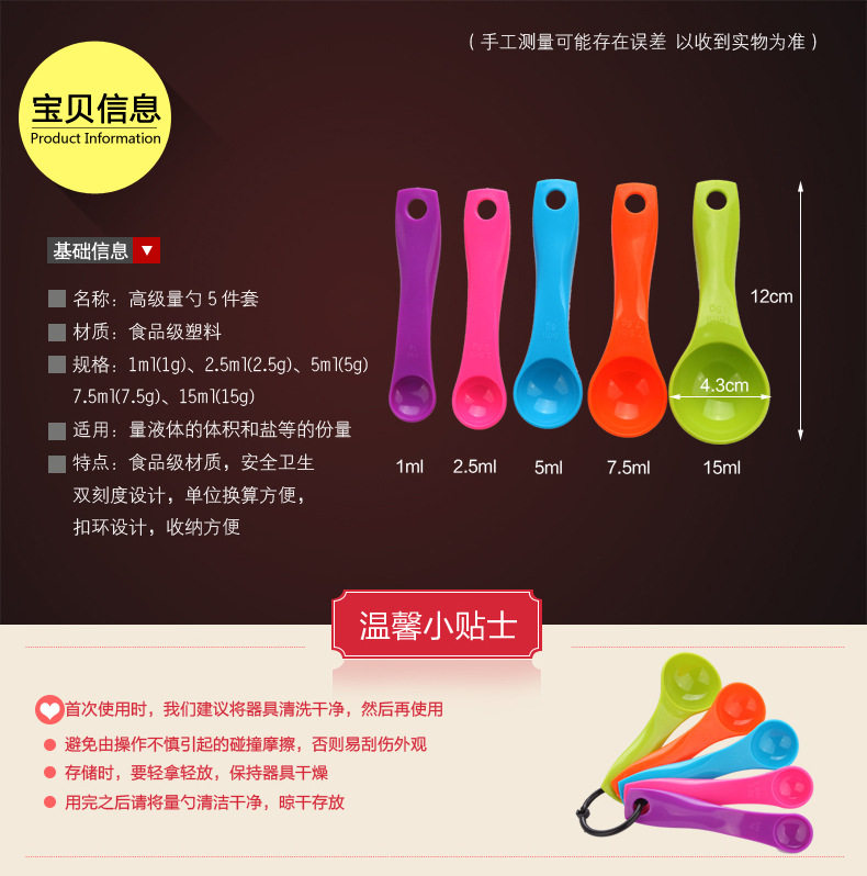 Baby Deputy food quantity spoon DIY cake baking tool with scale 1g milk powder spoon Keseveral spoon of colorful five pieces