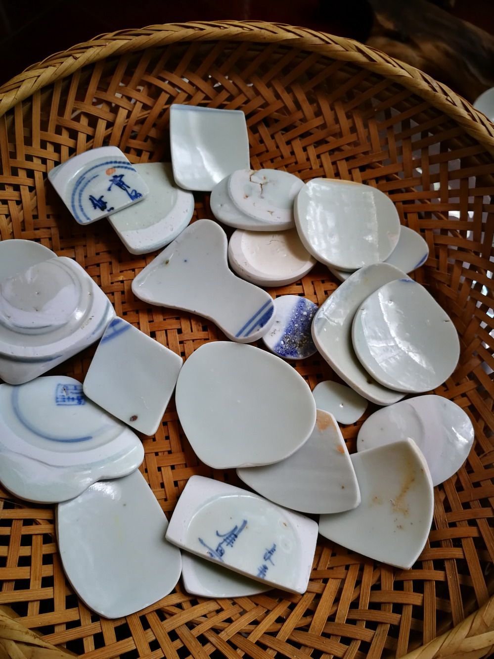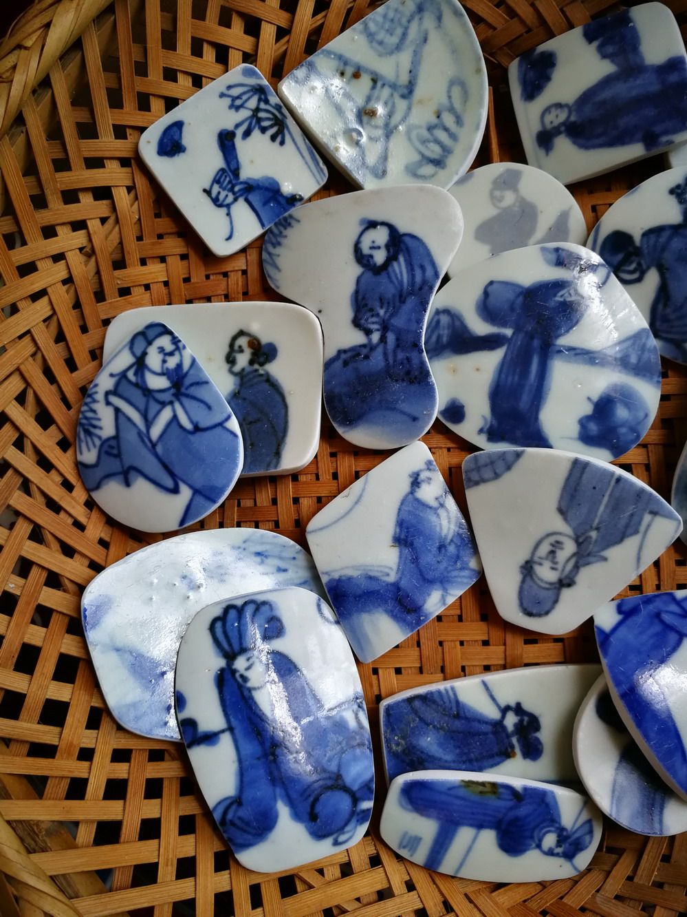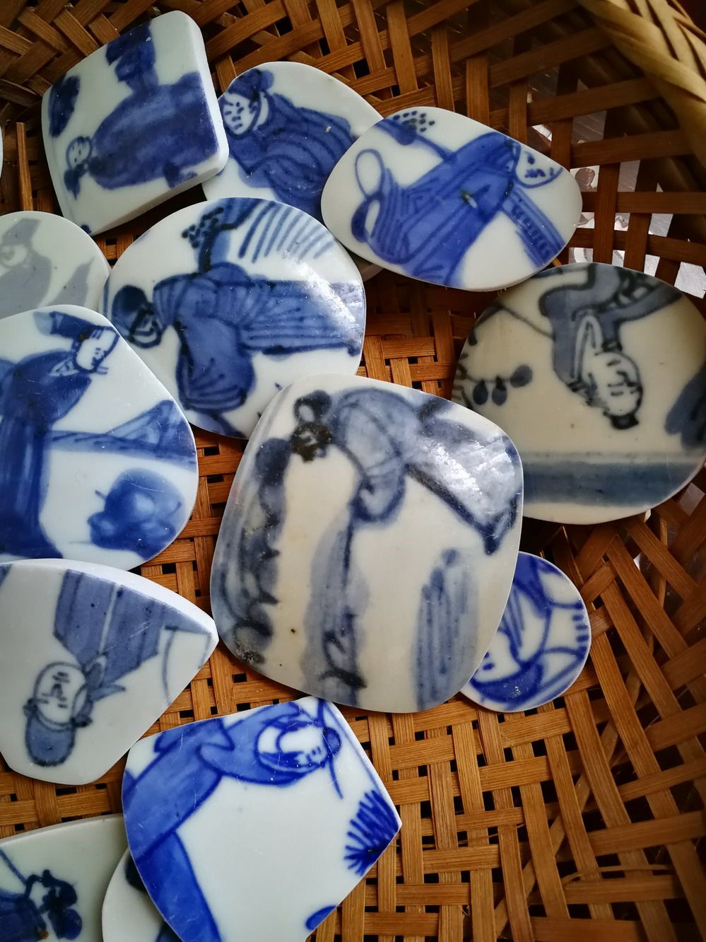Figure 50# Grinded Ming and Qing Dynasty Blue and White Ancient Porcelain Pieces Fragmented Porcelain Specimen Four Loves Fishing, Reading, Playing