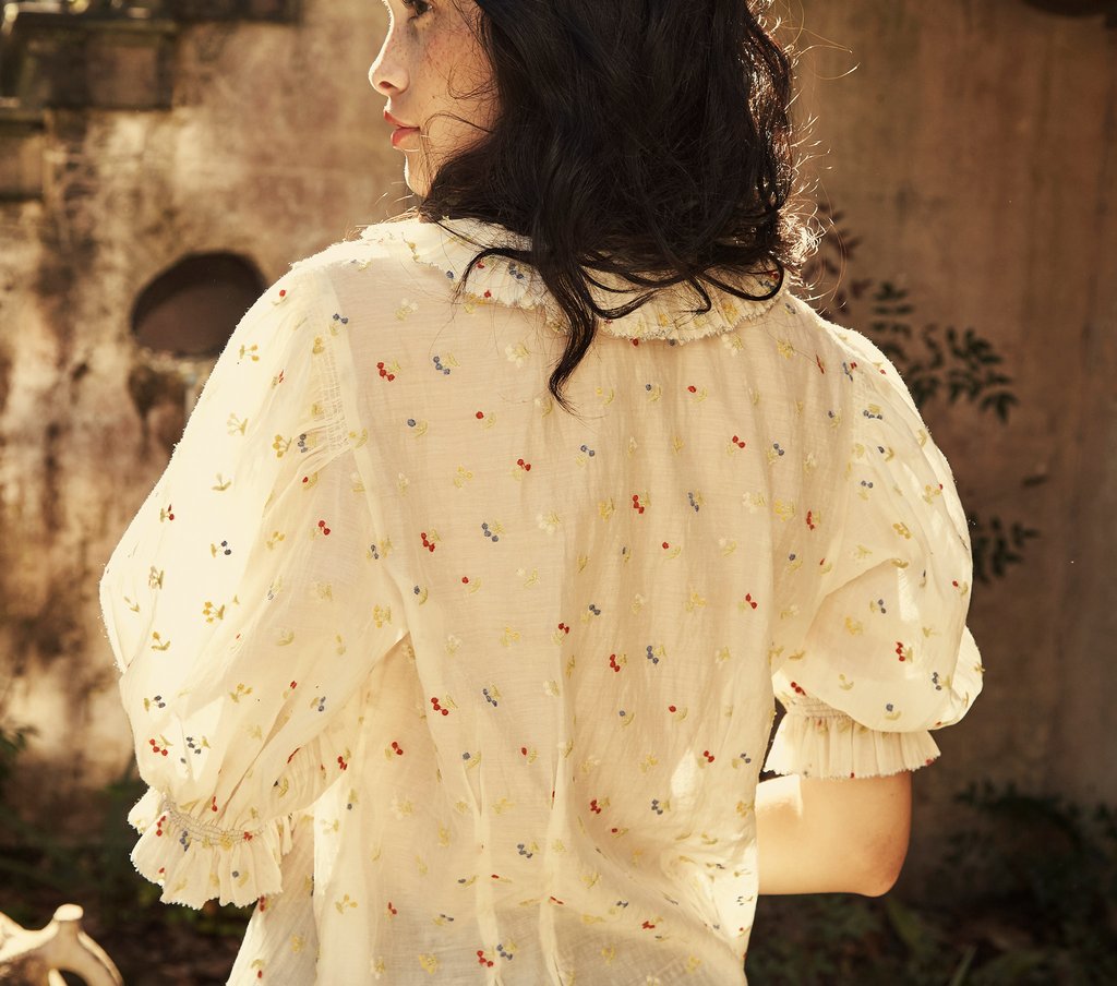 USA DOEN ORA printed lotus leaf lace with foam sleeve blouses French style retro INS holiday