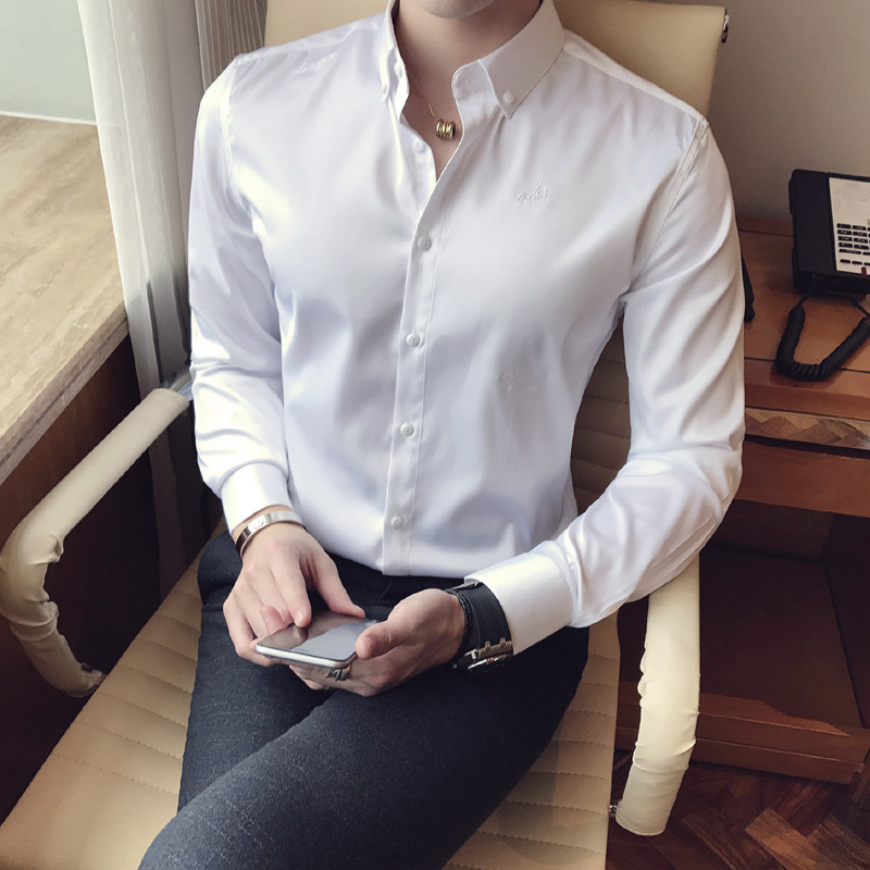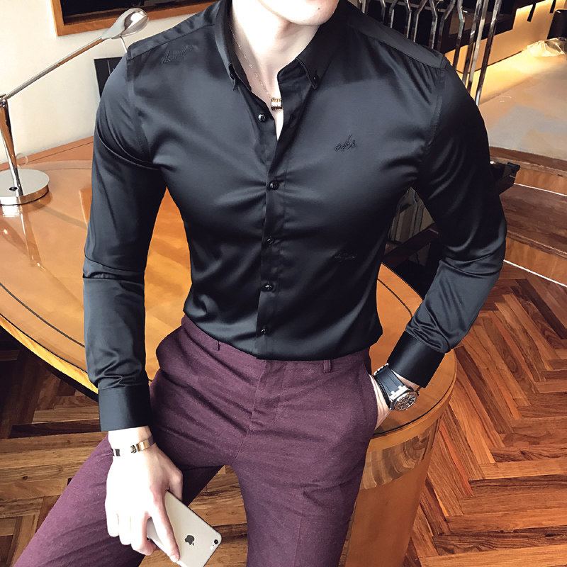 Ink Green Shirt Male Long Sleeve Trend Korean Version Business Positive Dress Embroidery Shirt Body Handsome FREE IRONING Ironing Inch