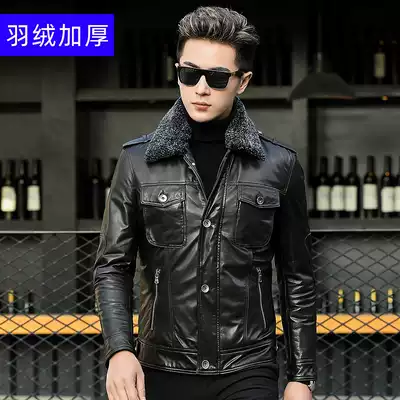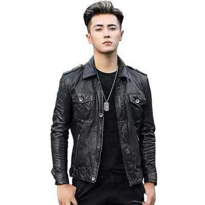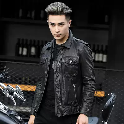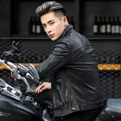 Haining leather men's leather short lapel slim sheepskin jacket men's motorcycle clothes Harley leather jacket trend