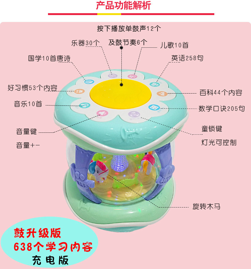 Charging children early education Puzzle Music Beats beat drums 0-1-3-year-old baby Handmade drums 8 Baby Toys for 6-12 months