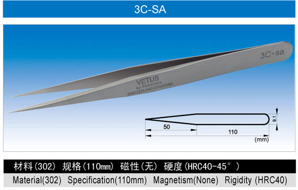 VETUS 3C-SA fine precision high elastic anti-magnetic acid anti - acid stainless steel short tip tweezers 110mm tweezers