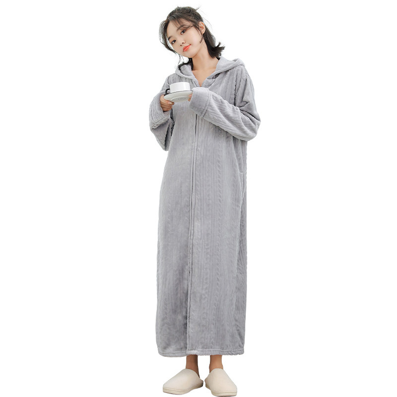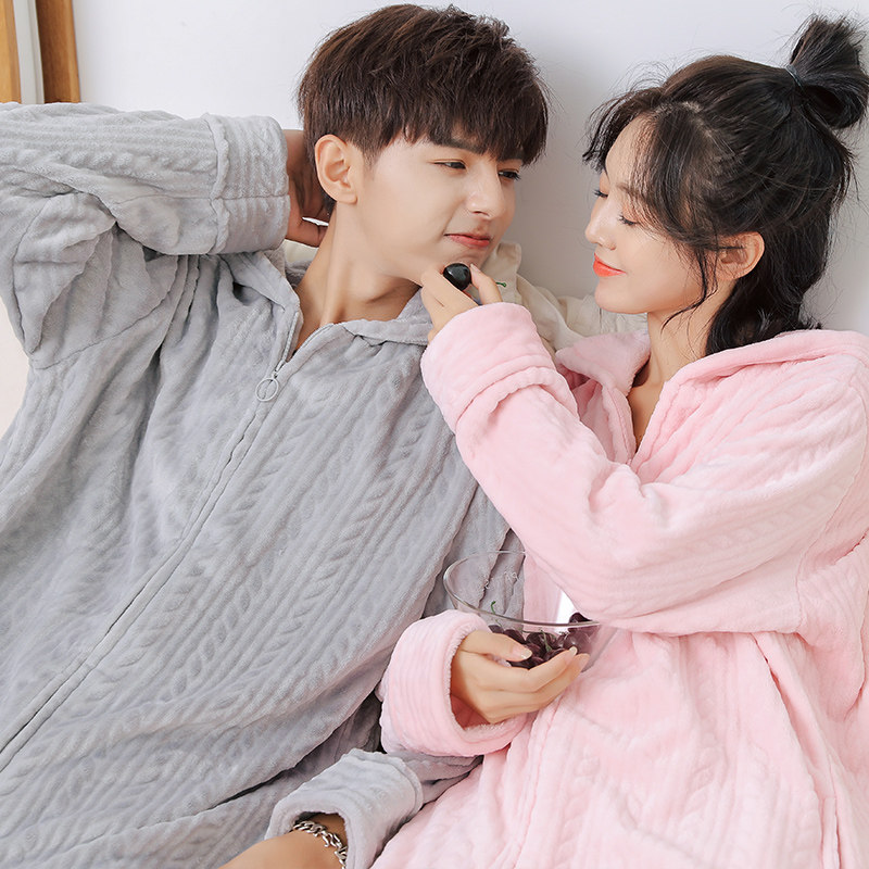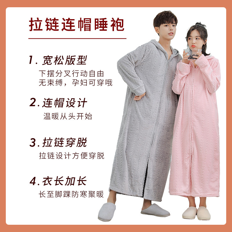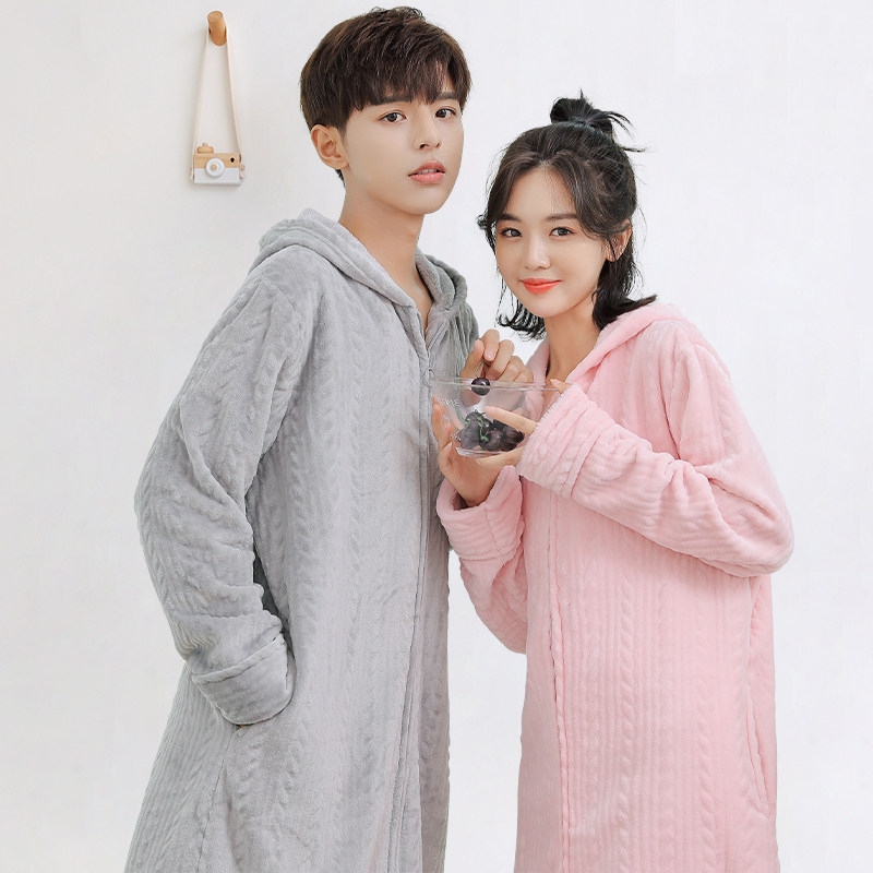 Flannel women's winter hooded nightgown warm, lengthened and thickened large size pajamas coral fleece men's couple bathrobes - Taobao