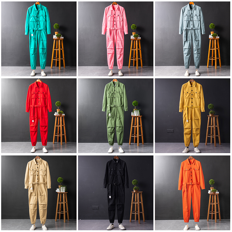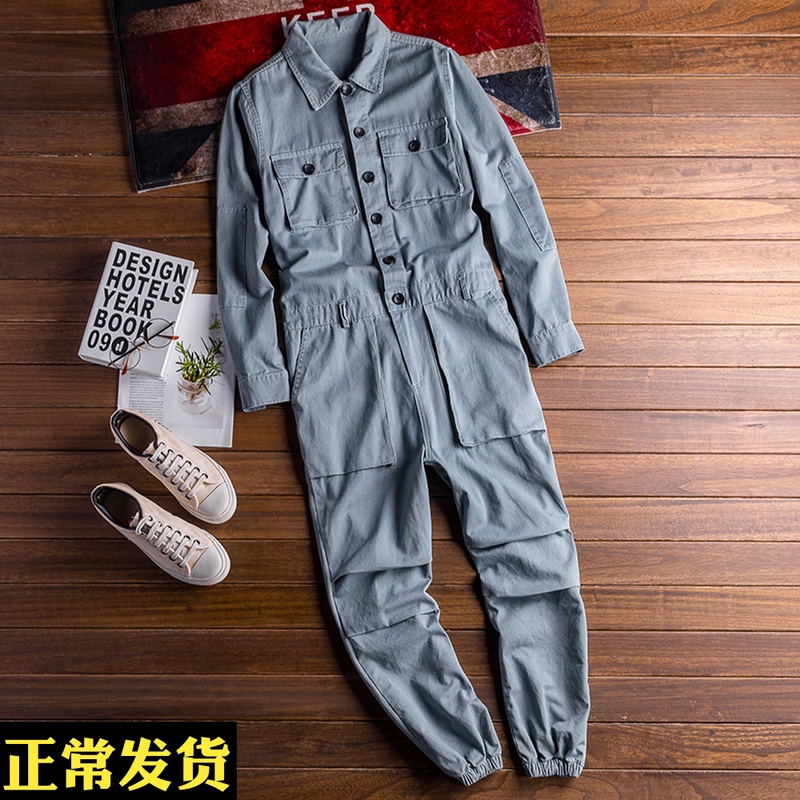 ins Super fire one-piece suit men's retro multi-pocket tooling jumpsuit Men's and women's lovers drawstring leg jumpsuit tide