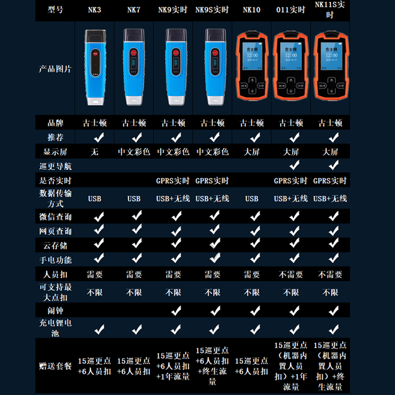 NK001 Stand-alone version NK002 stand-alone version with flashlight NK3 single-machine web page WeChat three-in-one version (including flashlight) NK7 color screen stand-alone web page WeChat three-in-one version (including flashlight) NK9GPRS real-time cloud patrol (including flashlight) NK9S real-time + wireless + flashlight + send lifetime traffic NL10 stand-alone web page WeChat triad version (including flashlight) NL11GPRS real-time cloud patrol (including patrol navigation + flashlight) NK11S real-time + patrol navigation + wireless + flashlight + Send lifelong traffic patrol point 30 patrol points 20 patrol points 10 signs 10