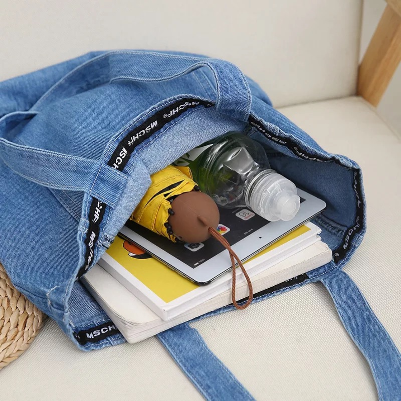 OK Japanese washed and old light blue denim shoulder handbag boys and girls canvas bag environmental protection retro shopping bag