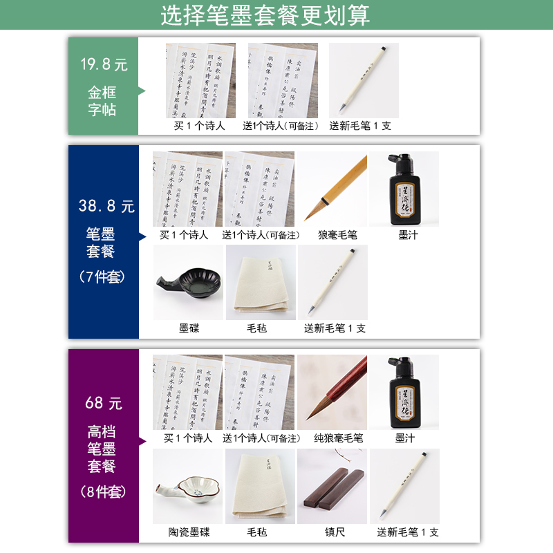 Li Bai 20 songs (buy 1 get 1 free 1) Du Fu 28 songs (buy 1 get 1 free) Bai Juyi 23 songs (buy 1 get 1 free) Wang Wei 24 songs (buy 1 get 1 get 1) Li Shangyin 27 songs (buy 1 get 1 get 1) Liu Yuxi 31 songs (buy 1 get 1 get 1 free) Meng Haoran 26 songs (buy 1 get 1 get 1) Du Mu 33 songs (buy 1 get 1 get 1 free) Liu Yong 14 songs (buy 1 get 1 free) Li Qingzhao 19 songs (buy 1 get 1 get 1 free) Ouyang Xiu 14 songs (buy 1 get 1 get 1 free) Lu You 22 songs (buy 1 get 1 free) Qin Guan 17 songs (buy 1 get 1 get 1) Large set (1 each of the 14 models) send pure wolf brush 1 this one does not participate in buy 1 get 1 free