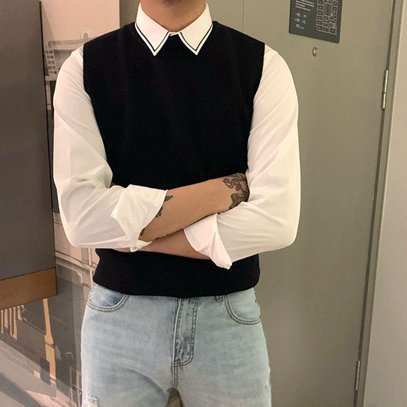 BROTHER homemade men's knitted fashion vest T-shirt Korean trend solid color wild casual dress short sleeve