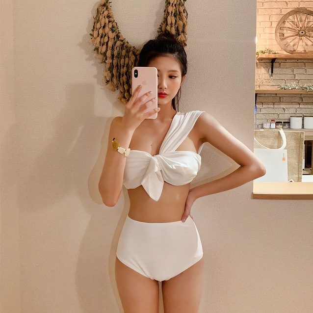 2019 new Korean minimalist bikini Sexy inclined shoulder small breasts to woo high waist cover with slim two-piece swimsuit woman