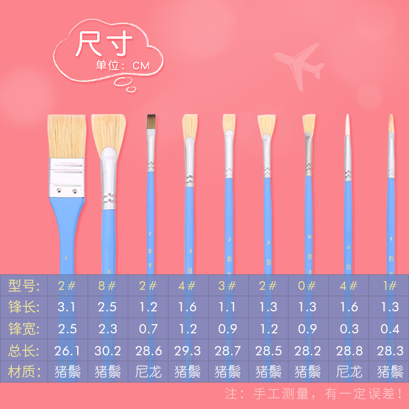 1#Bristle flat peak pen 2#Bristle fan-shaped pen 2#Bristle brush 4#Bristle fan-shaped pen 4#Nylon hair hook pen 8#Bristle fan-shaped pen 2#Nylon hair flat peak pen
