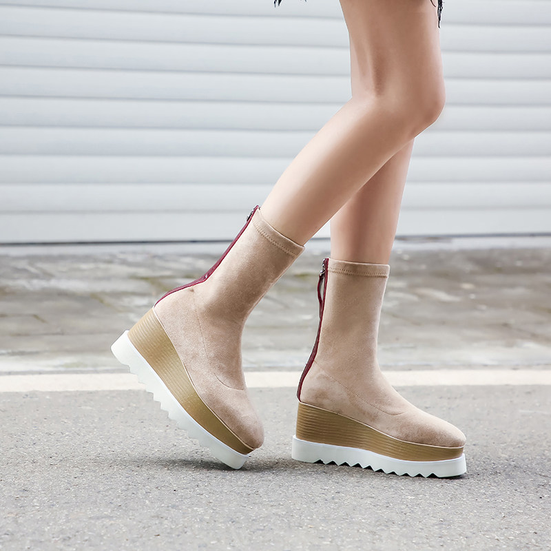 European Station Autumn Winter High Heel Thick Base Short Boots Genuine Leather Suede Cakes Slim slim boot Slope heel elastic boot Heightening Socks Boots