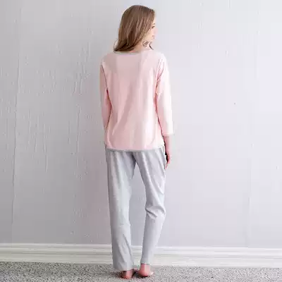 Fenten long sleeve pajamas women cotton spring and autumn thin two-piece cute Korean round neck cotton home suit