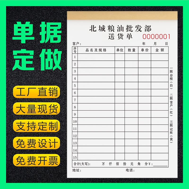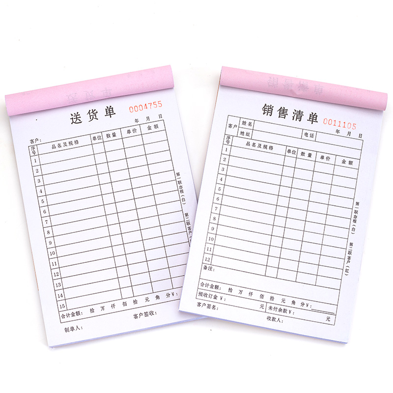 Two copies of the delivery order, three copies of the receipt, customized sales list, customized purchase, delivery, return order, two copies of the invoice, invoice, order, shipping code, inventory, storage document, customized