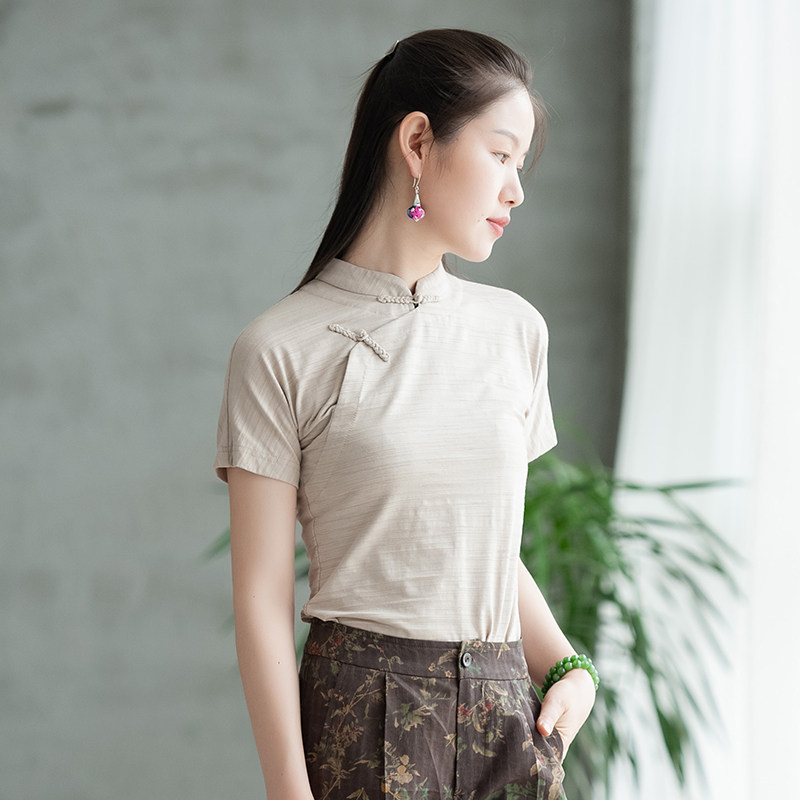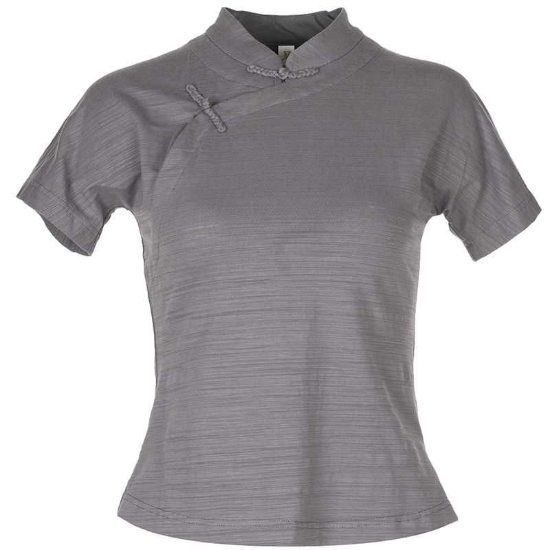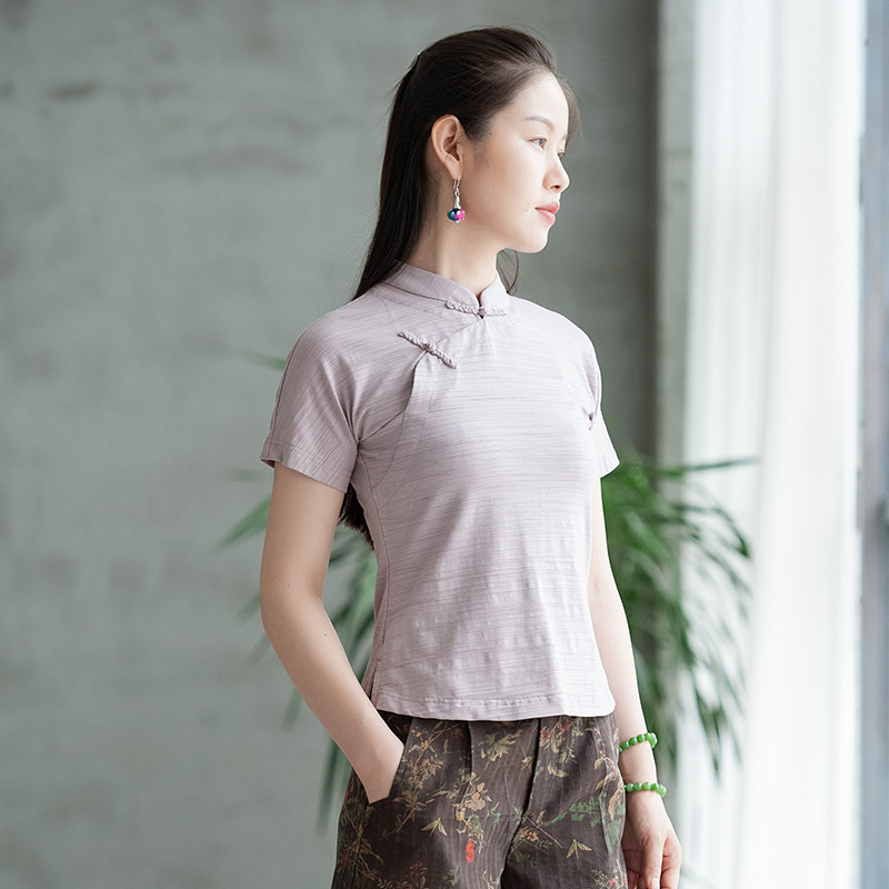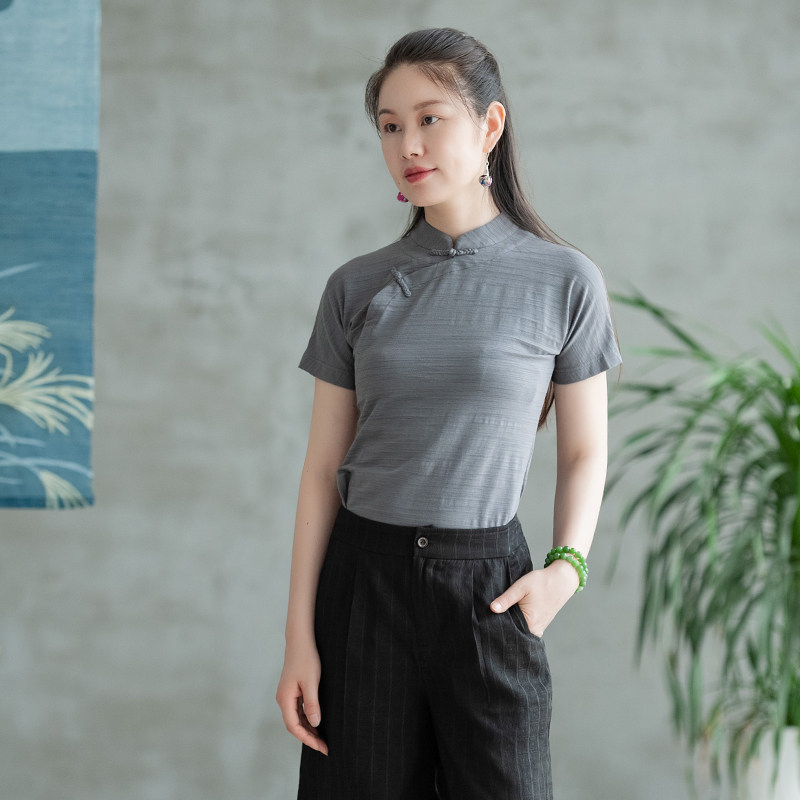Strangeness flowers open lapis (Lanyue) Bamboo Festival Cotton Blouse Women Stand-up Retro T-Shirt 100 Lap Answer Shea