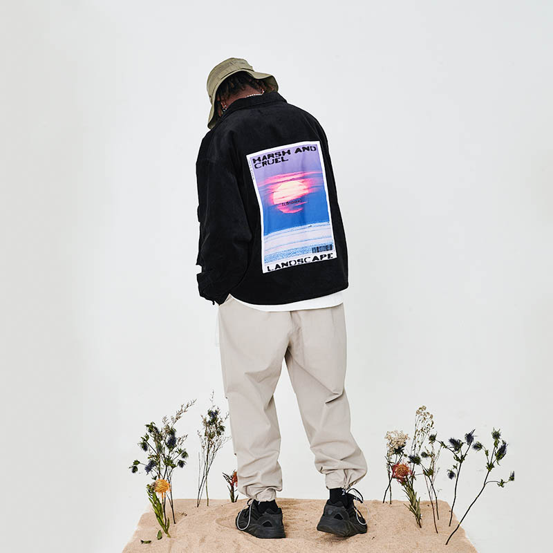 harshandcruel seaside sunset print corduroy lapel jacket street oversize jacket for men and women