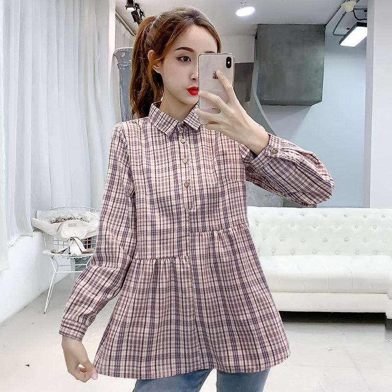Maternity T-shirt Autumn Korean version long-sleeved plaid maternity doll shirt shirt short top fashion two-piece suit