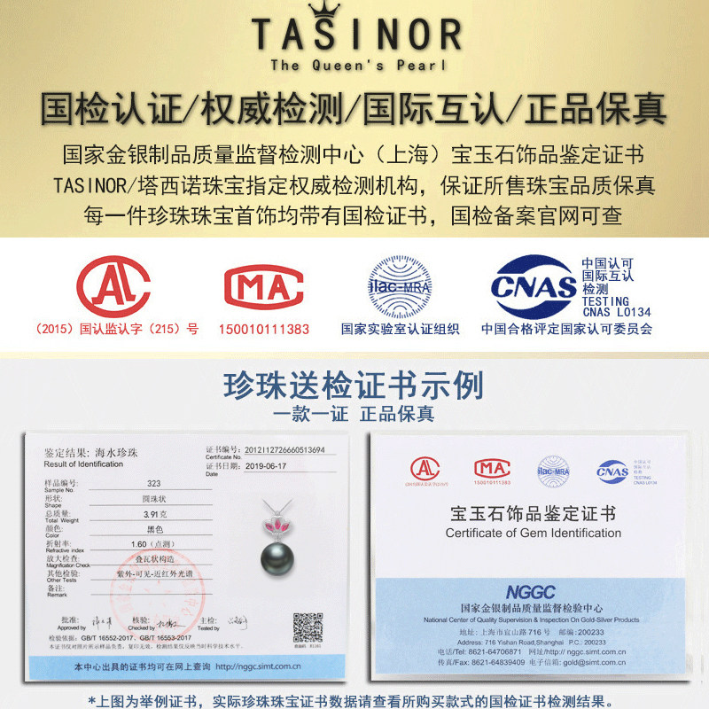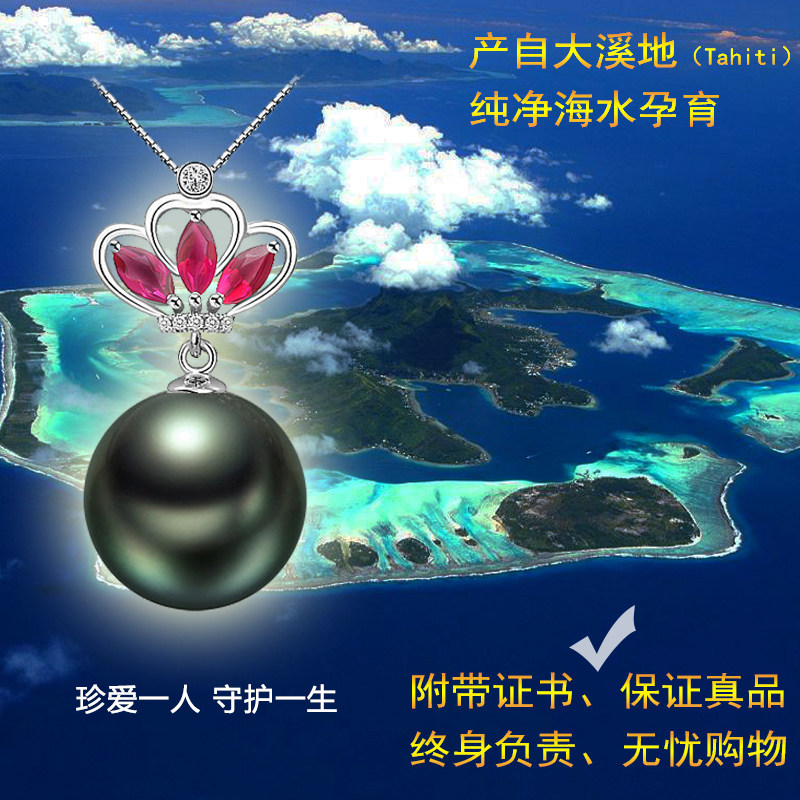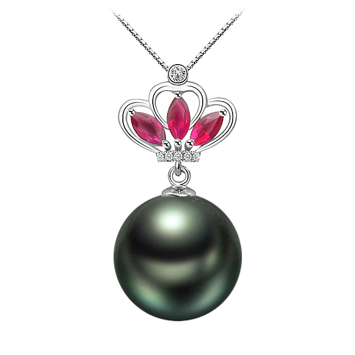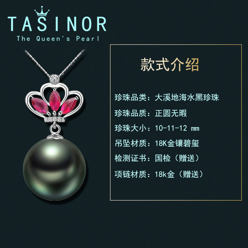 TASINOR Jewelry Tahitian Seawater Black Pearl Pendant Necklace 18k Gold Inlaid Tourmaline Perfect Round Gift