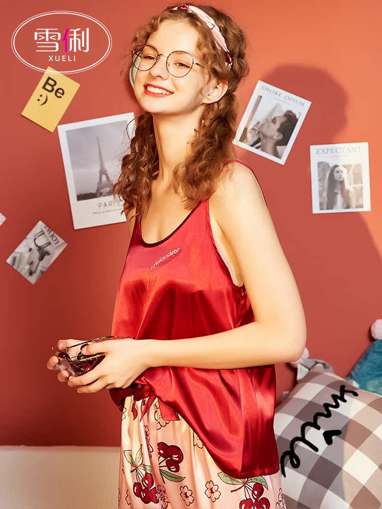 Xueli pajamas women's spring, autumn and summer ice silk thin long-sleeved home clothes sexy suspenders imitation silk three-piece suit