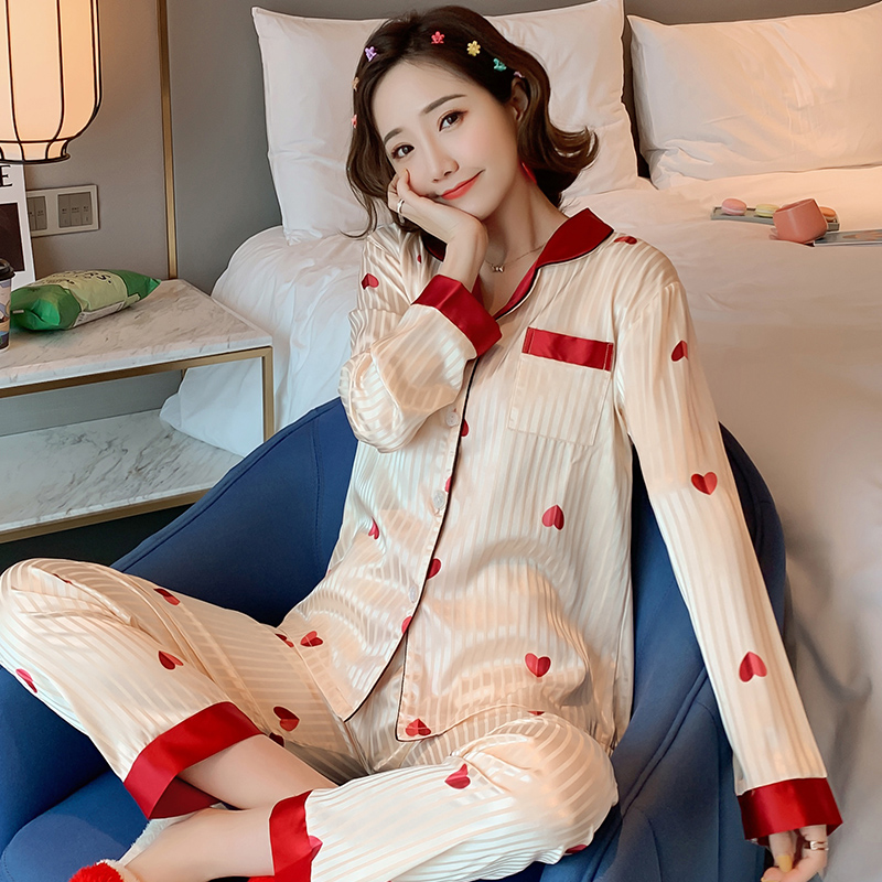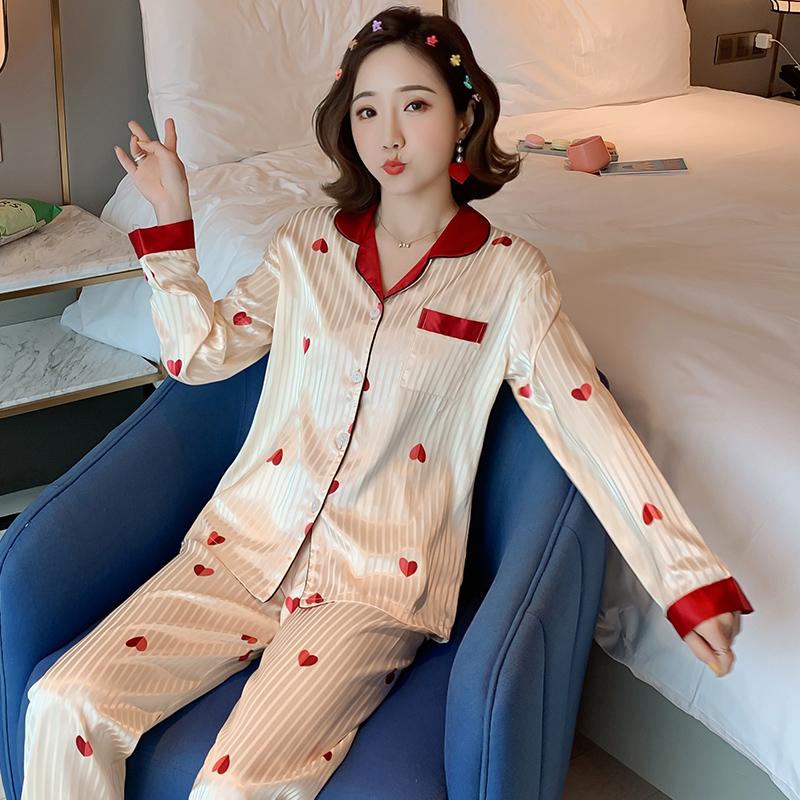 Spring Fall Pyjamas Women's Summer Thin Ice Silk Korean Version Cute Student Long Sleeve Cardiovert Suit True Silk Home Clothing