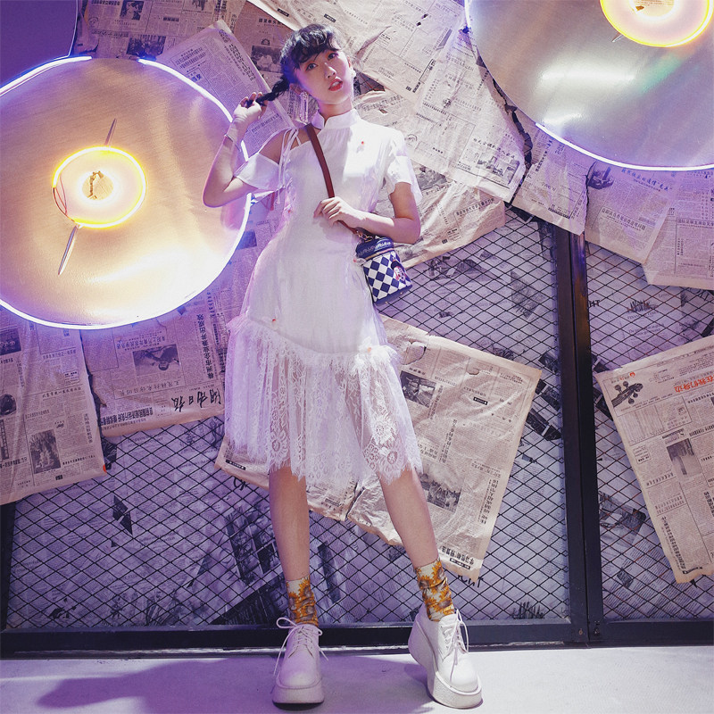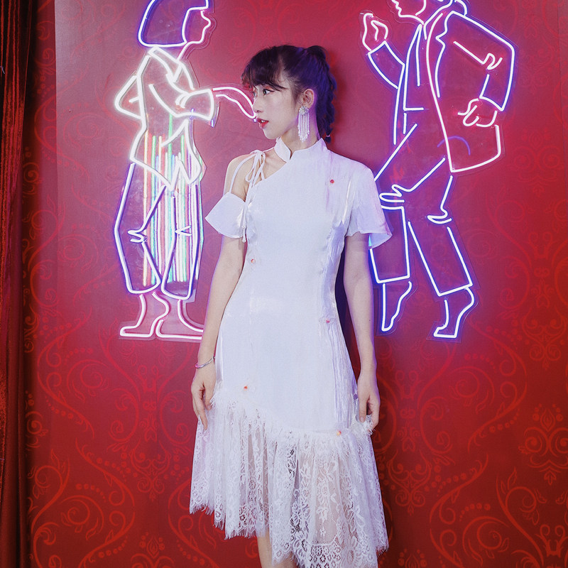 Huang Niuniu students original homemade "Butterfly Dream" three-dimensional butterfly asymmetrical strapless modified Cheongsam dress