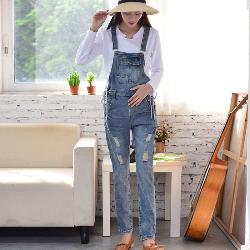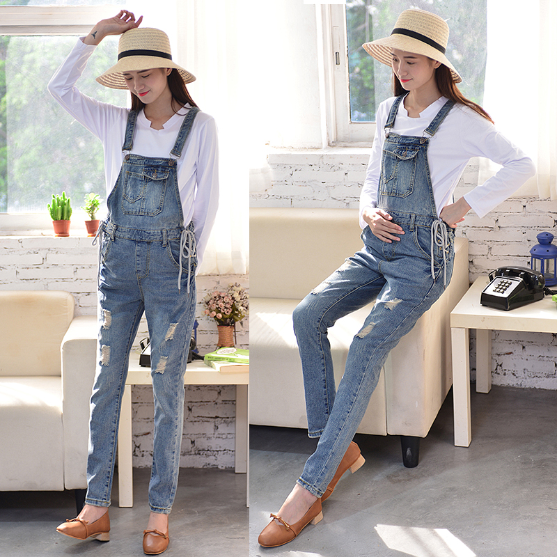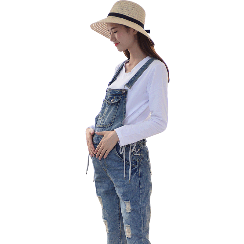 Pregnant women hold baby bag pants early autumn loose jeans spring and autumn fashion models, holes, trends, pregnancy suits