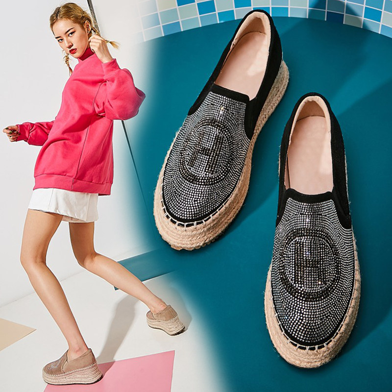 2022 spring new straw wedge shoes women's leather thick-soled lazy platform shoes rhinestone high-heel slip-on women's shoes