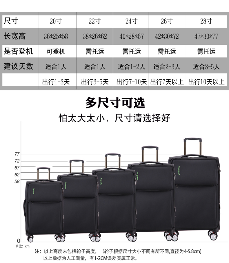 20 inch (no side handlebar can be boarded) 22 inches (1-3 days short trip required) 24 inches (3-5 days long trip required) 26 inches (4-7 days long haul