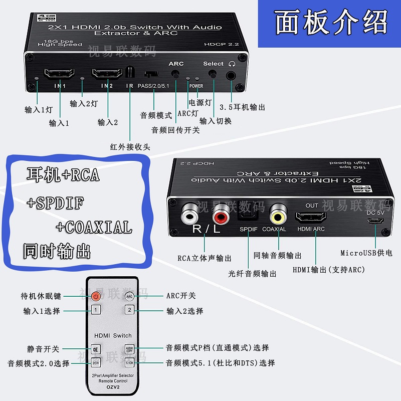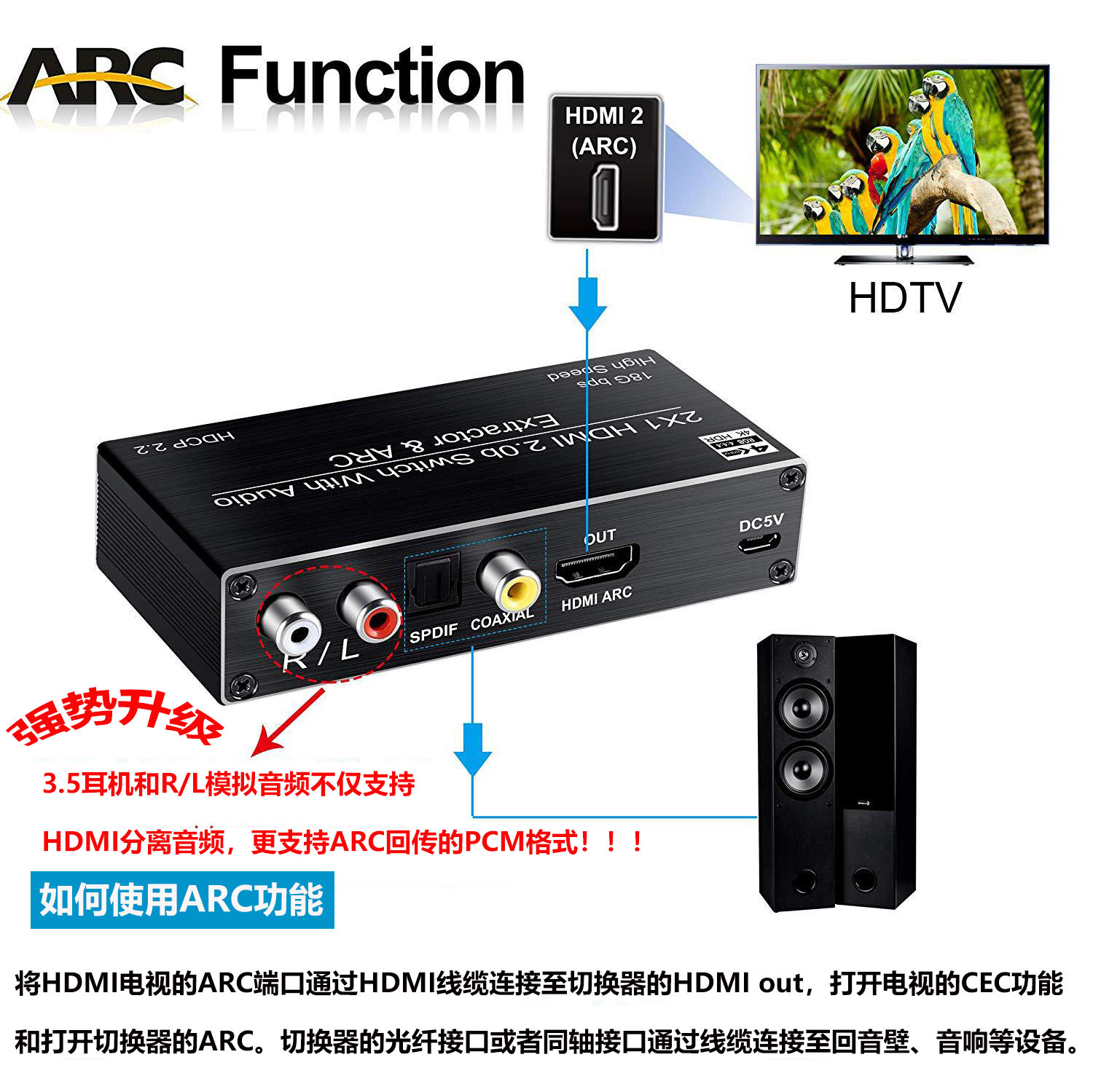 HDMI2 0 switcher two-in-out switch 2x1 high-definition audio separation ARC HDCP2 2