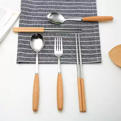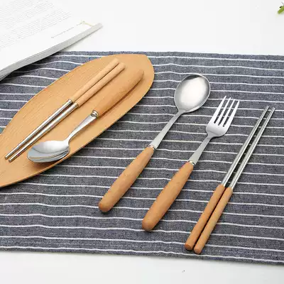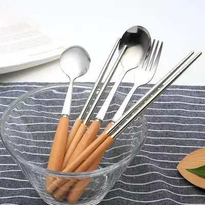 Japanese wooden handle stainless steel chopsticks spoon tableware fruit dessert knife and fork Western food steak knife and fork wooden spoon lettering