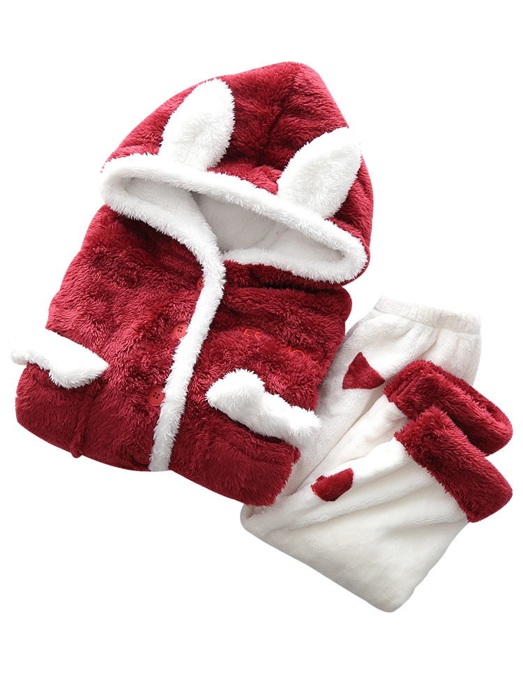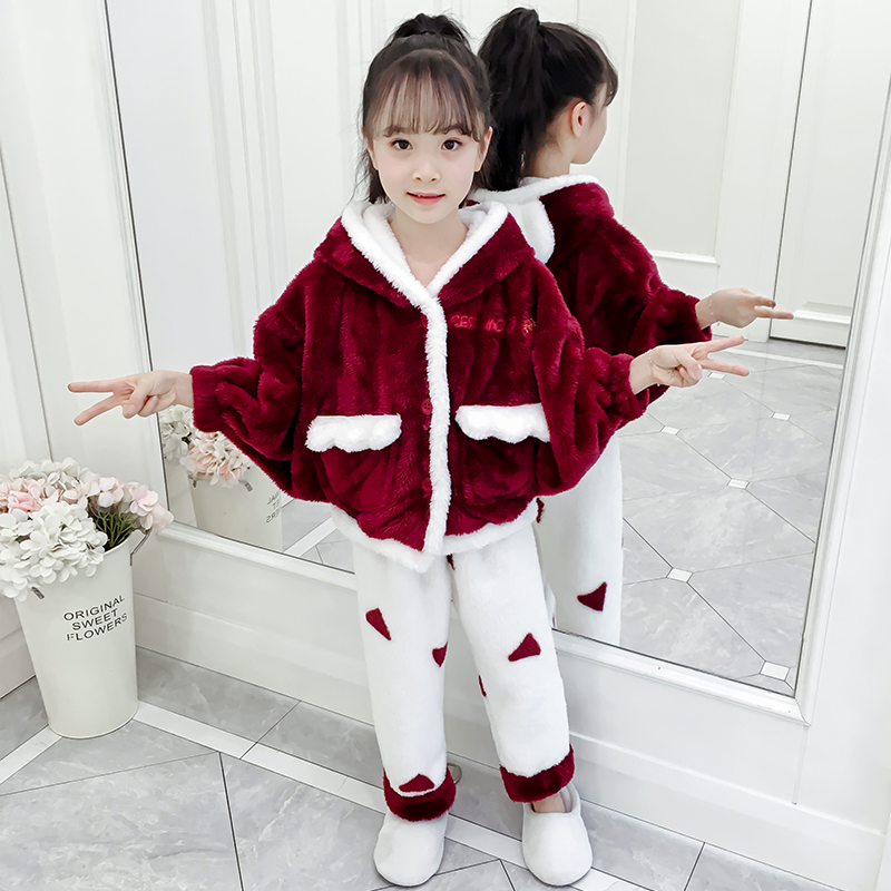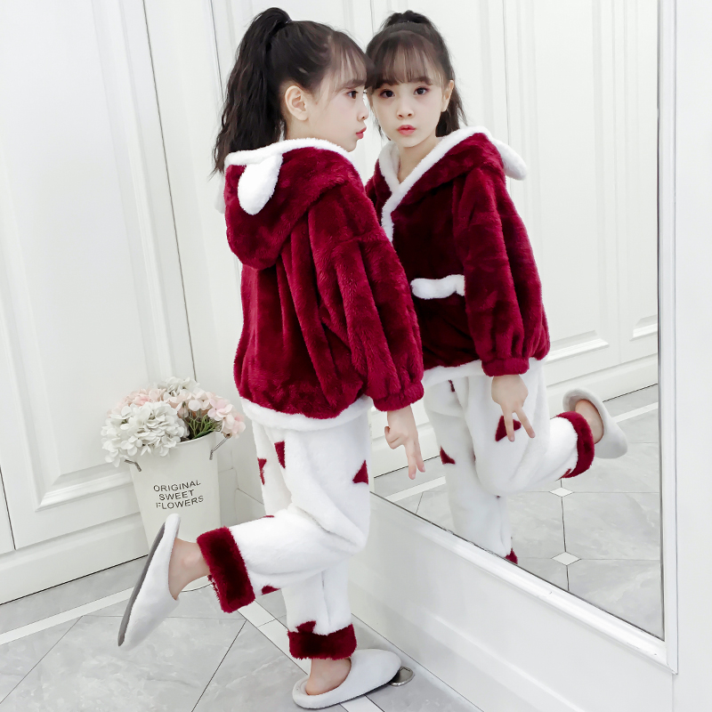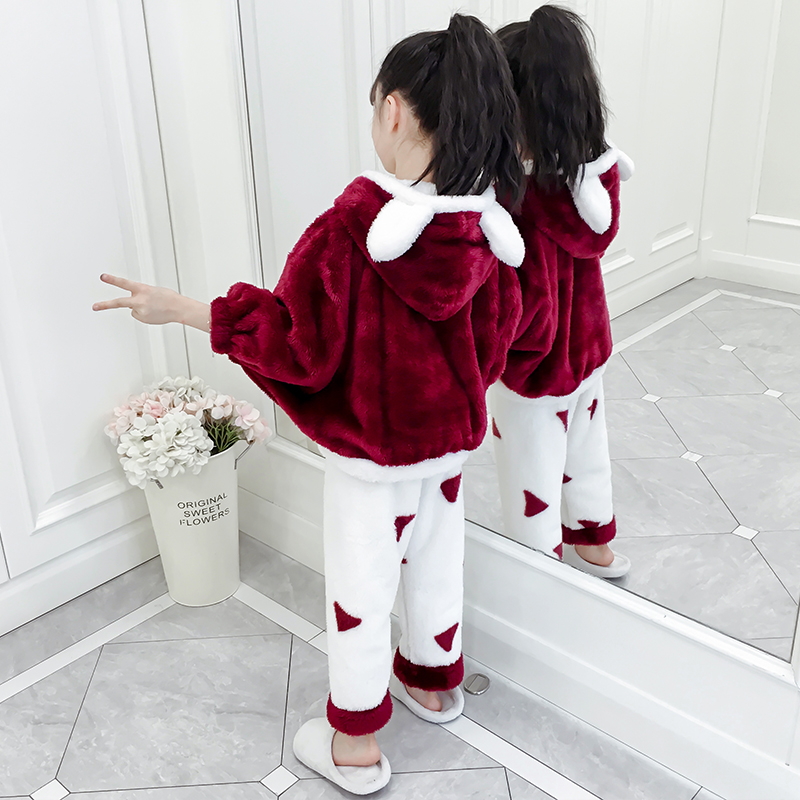 Children Coral Suede Pyjamas Girls Autumn Winter Thickening of Flannel Suede Big Boy Warm Baby Home Suit Suit