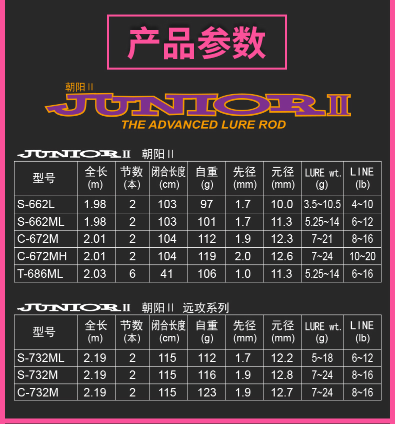 C-672M (gun handle rod) C-672MH (gun handle rod) S-662ML (straight shank rod) S-662L (straight shank rod) S-732M (far attack) (straight shank rod