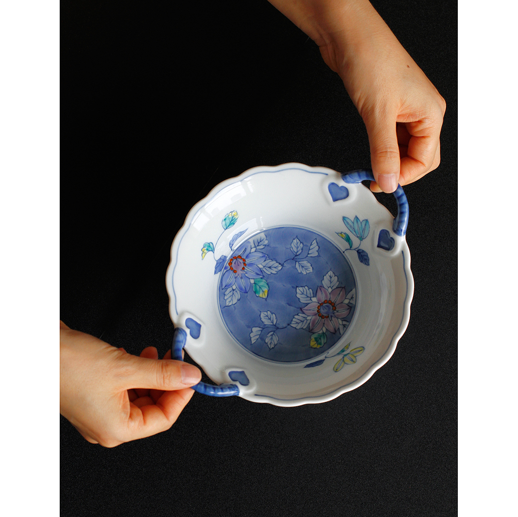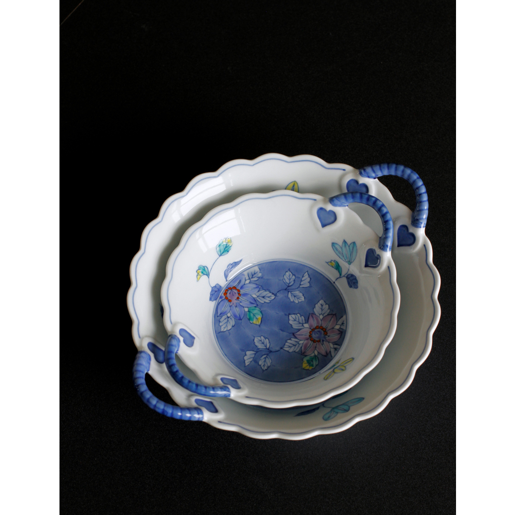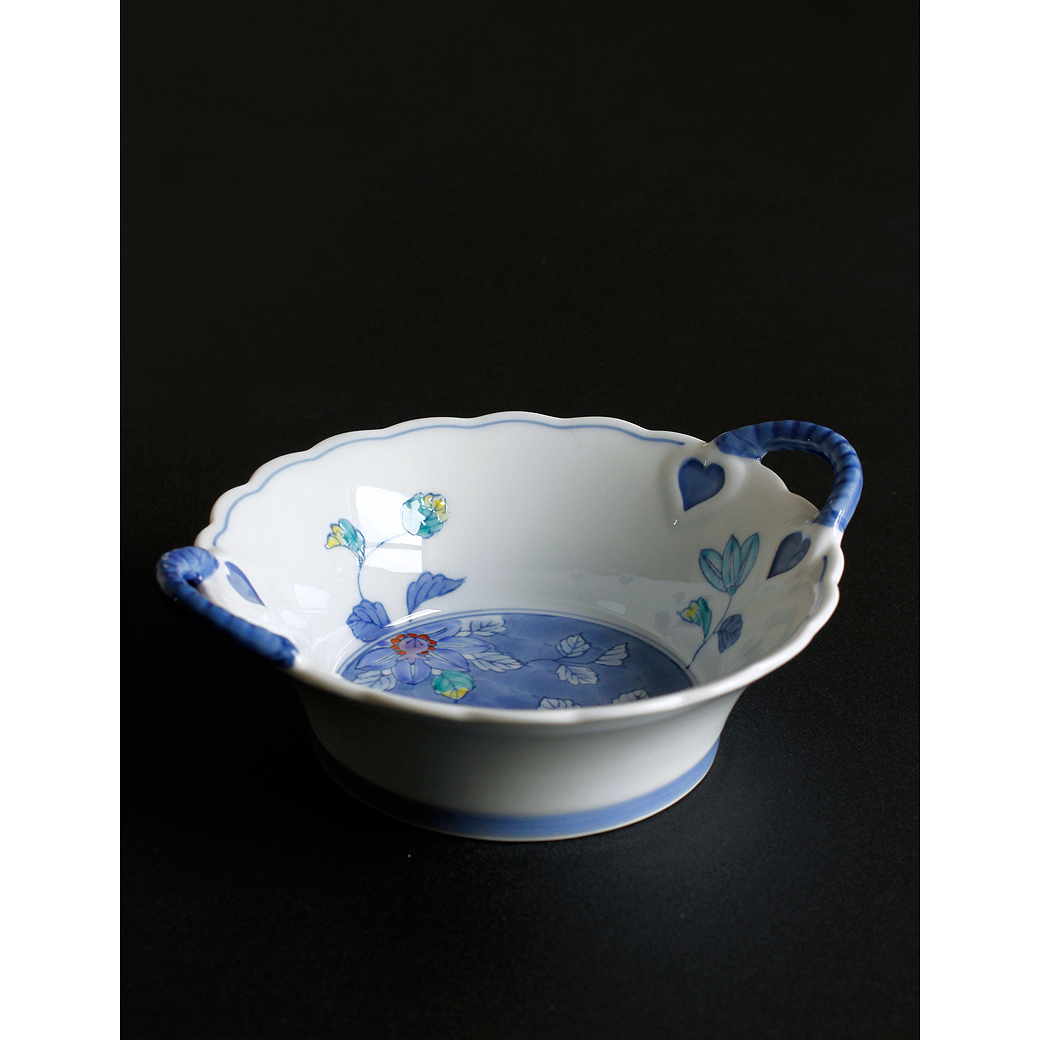 Japan's original imported Arita burning hand painted color glaze blue and white plus color double ear lace with bracelet small pot Japanese deep plate