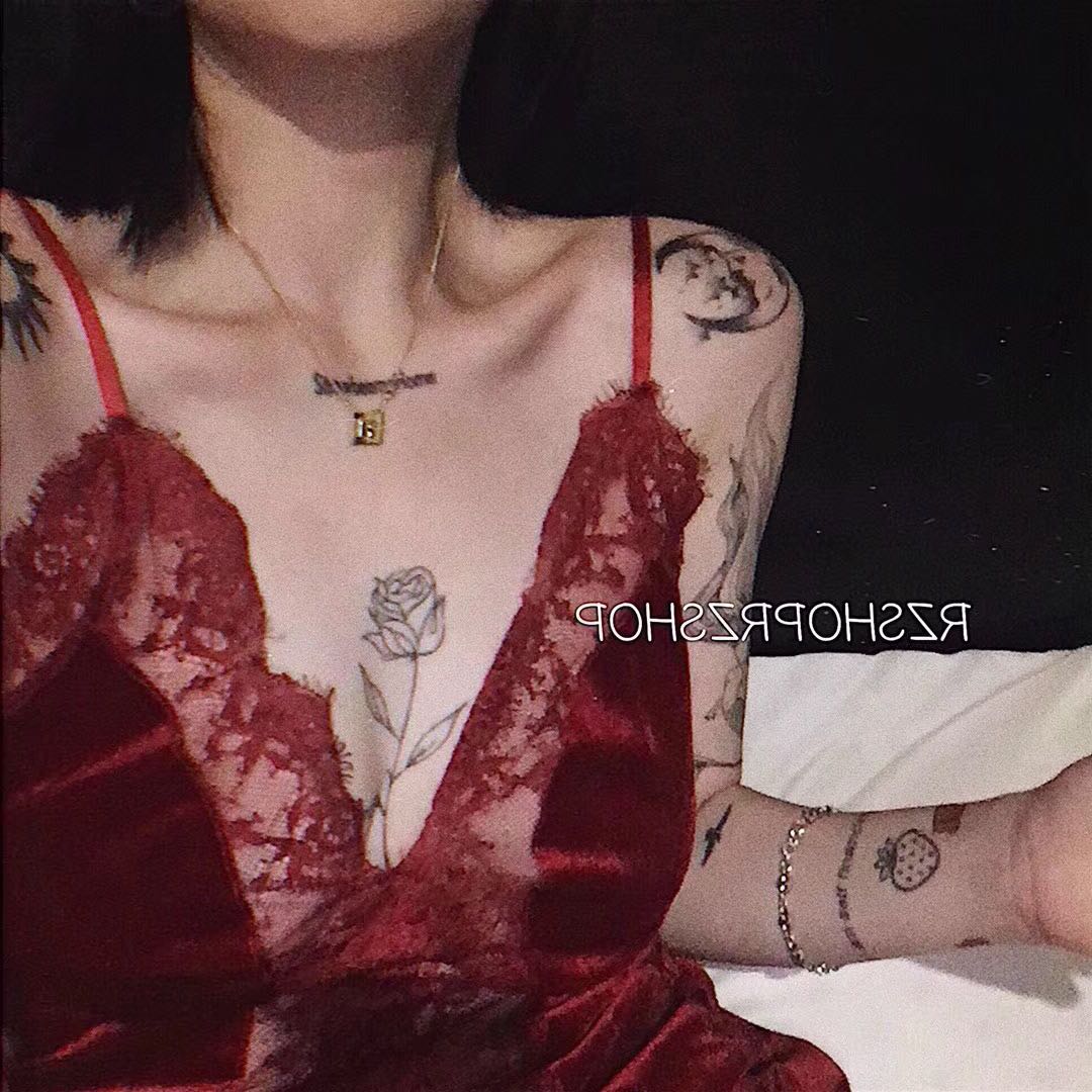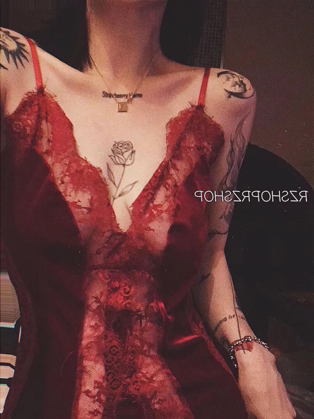 Super fire-blooded lace embroidered hollow nightdress sexy see-through underwear wine red pajamas set net red with the same paragraph
