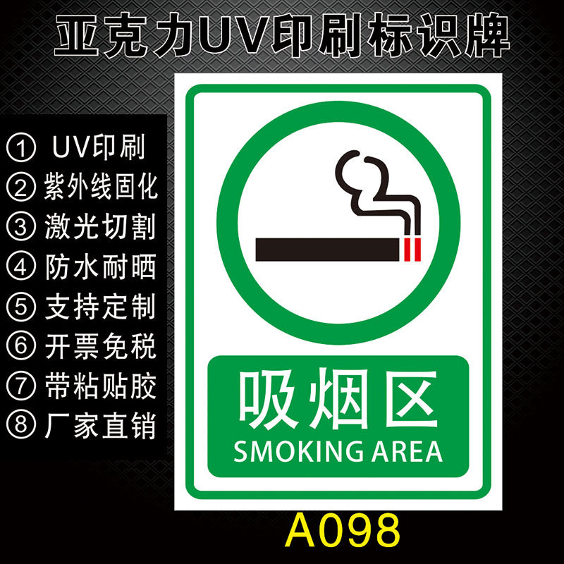 A097 no parking vehicles in the workshop (2MM acrylic UV printing + strong gum) A098 smoking area (2MM acrylic UV printing + strong gum) A099 no direct washing equipment with water gun (2MM acrylic UV printing + strong gum) A100 non-staff are not allowed to enter (2MM acrylic UV printing + strong gum)