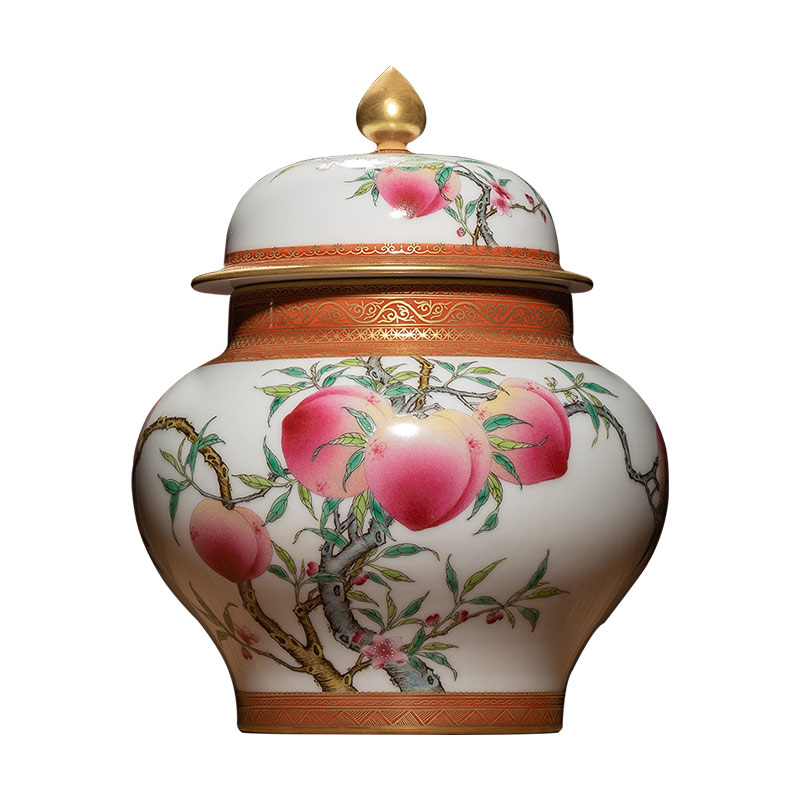 Qing Qianlong alum Red painted gold nine peach pattern lid jar Qing Qianlong Alum Red painted gold Nine peach pattern lid jar (live studio exclusive)