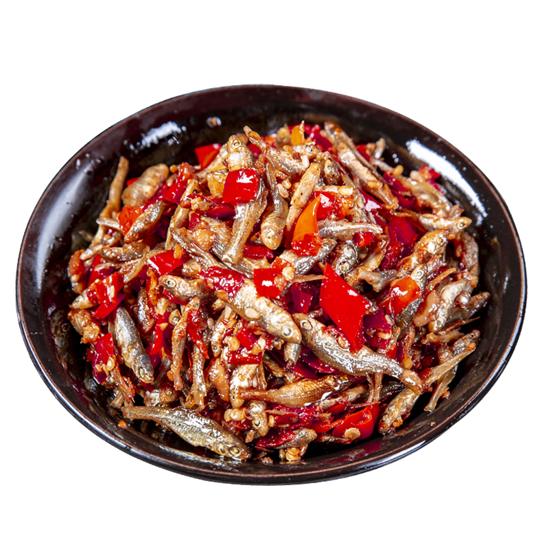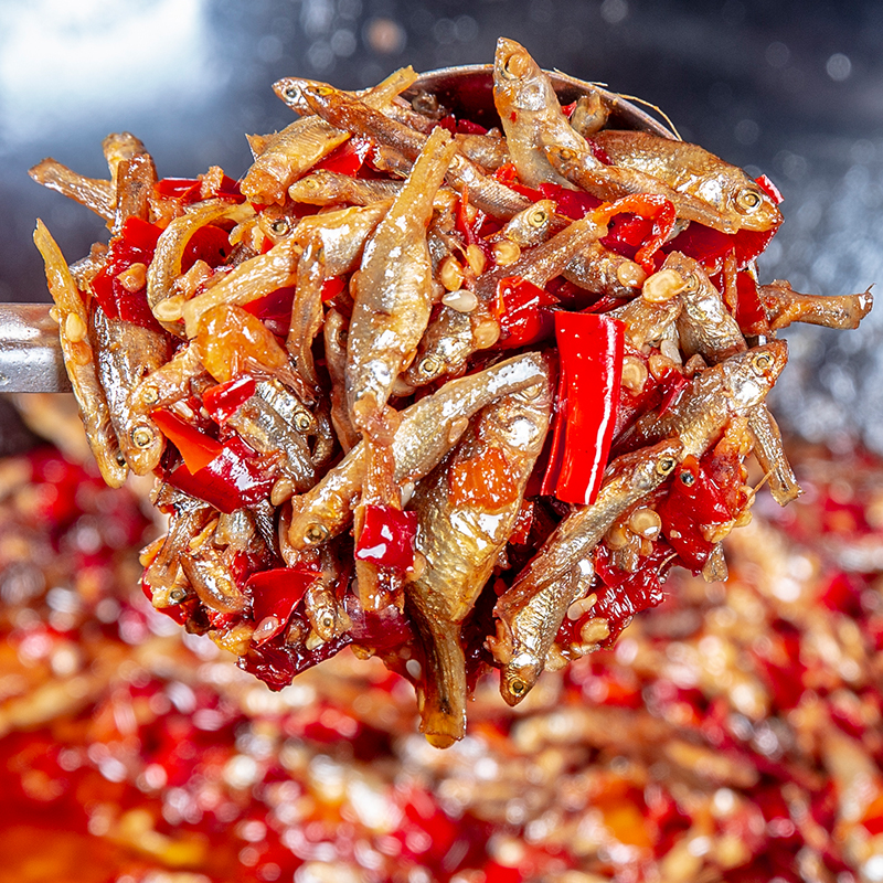 Hunan special production of chopped pretzels firewood and fish dried down the rice dish with spicy flavored fish wool fish wool fish small fish paparazzi farmhouse homemade snacks