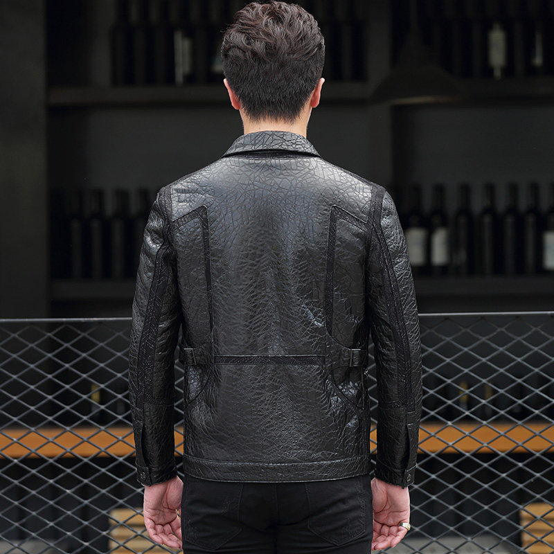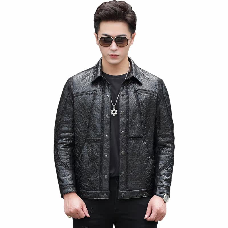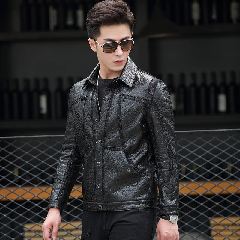 Broken code spring and autumn Haining Leather City men's lapel leather jacket men's short motorcycle leather goatskin coat