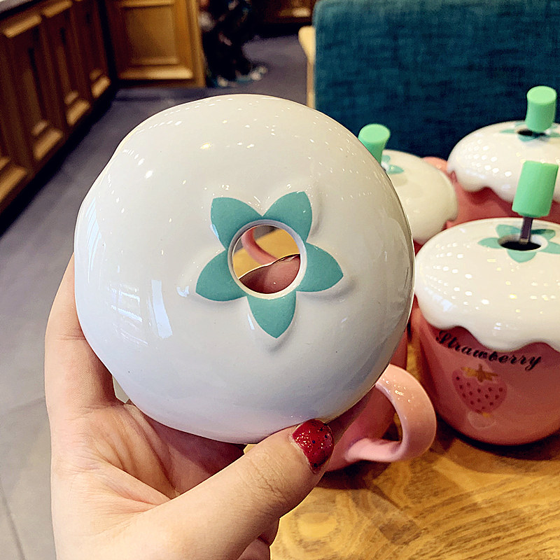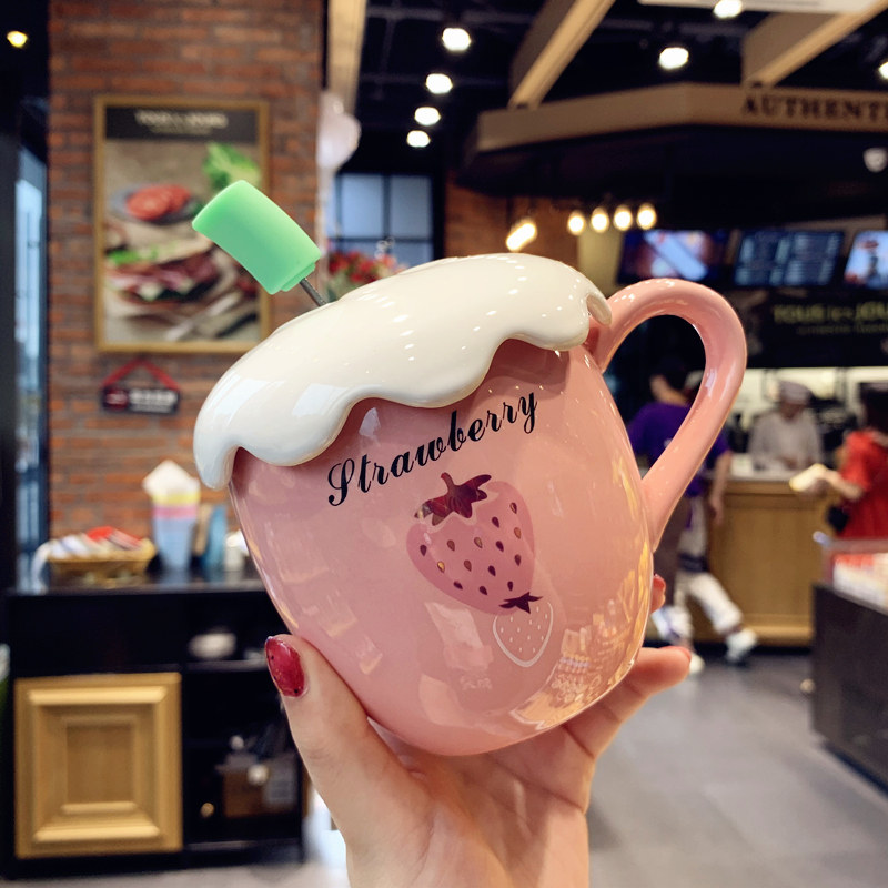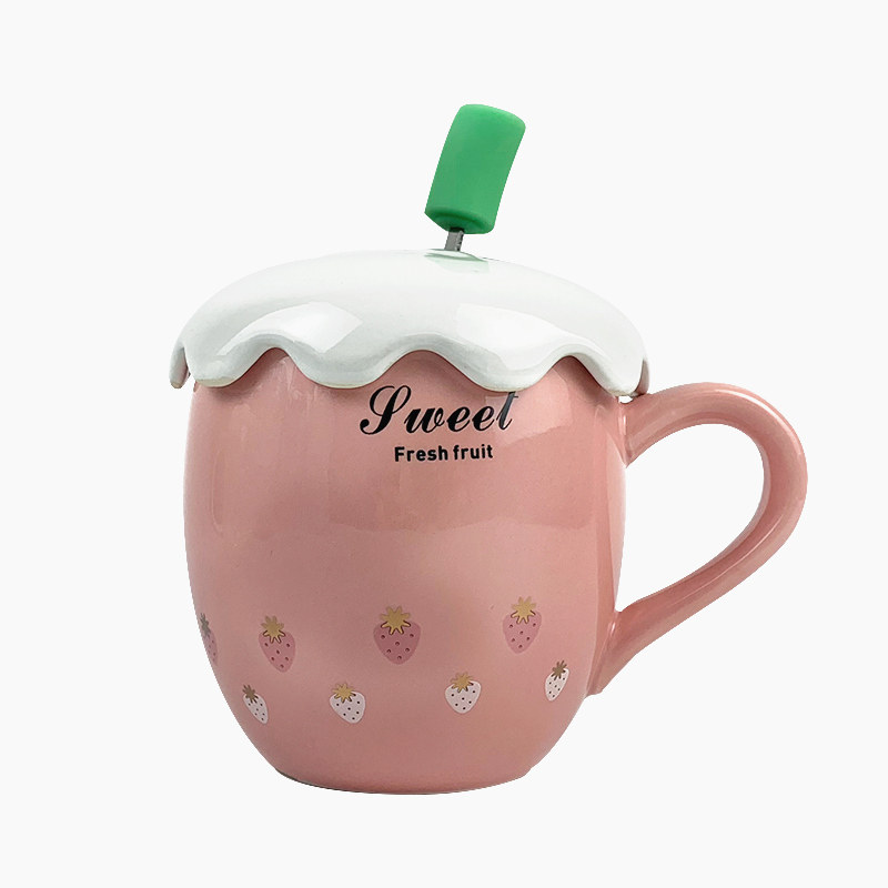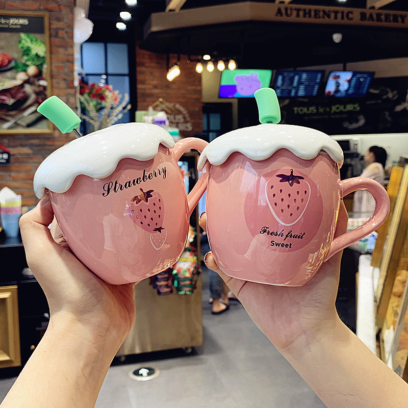 Han Edition Creative Personality Ceramic Cup Cartoon Strawberry Big Belly Water Cup With Lid Spoon Softgirl Cute Schoolgirl Mark Cup