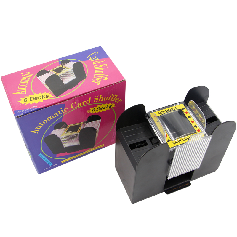 Shuffler that can shuffle 6 decks of cards, 3 decks of red and blue poker each (without shuffler) 4 AA batteries (without shuffler)