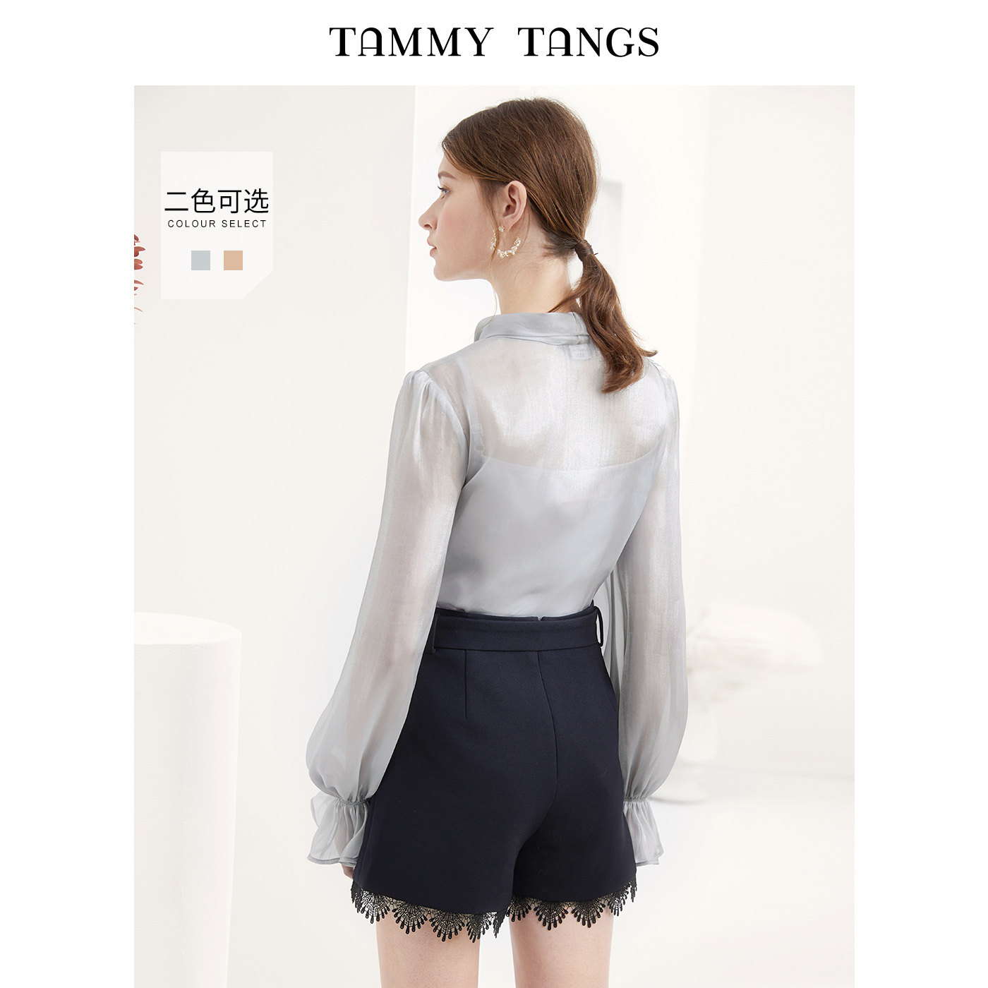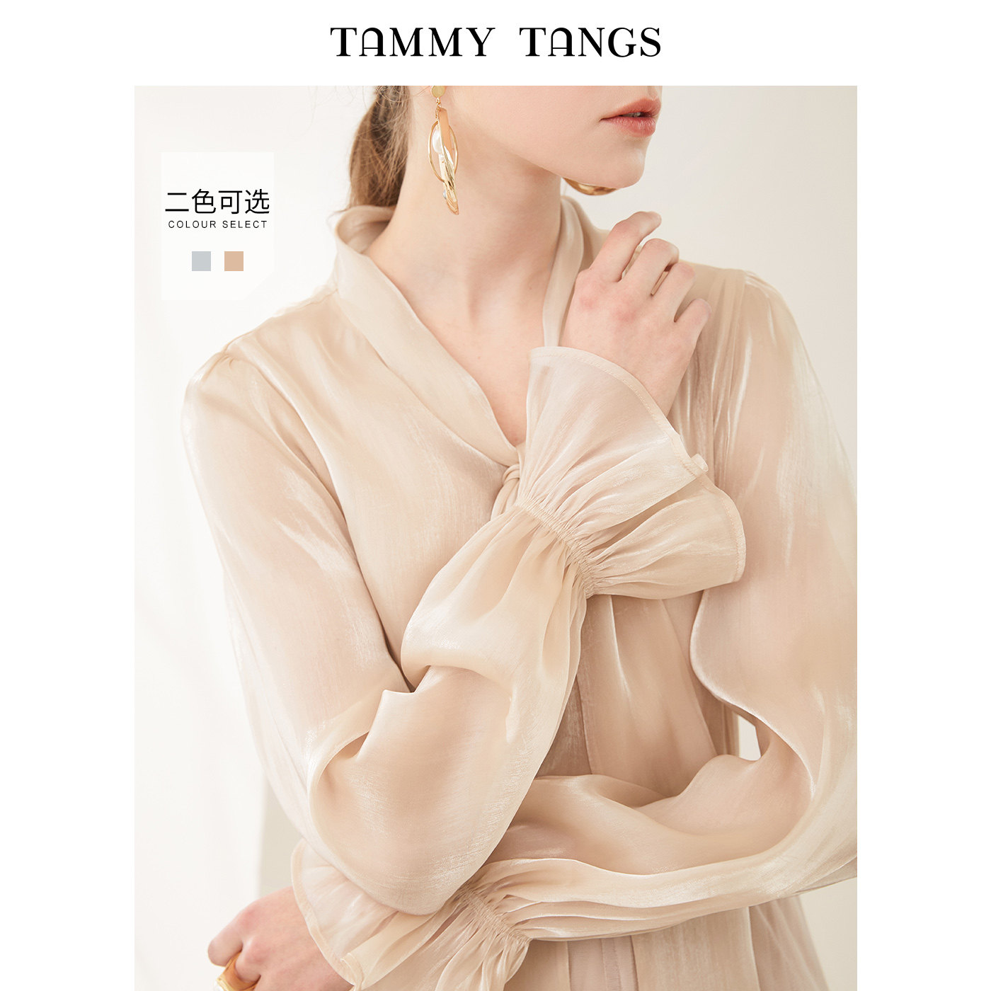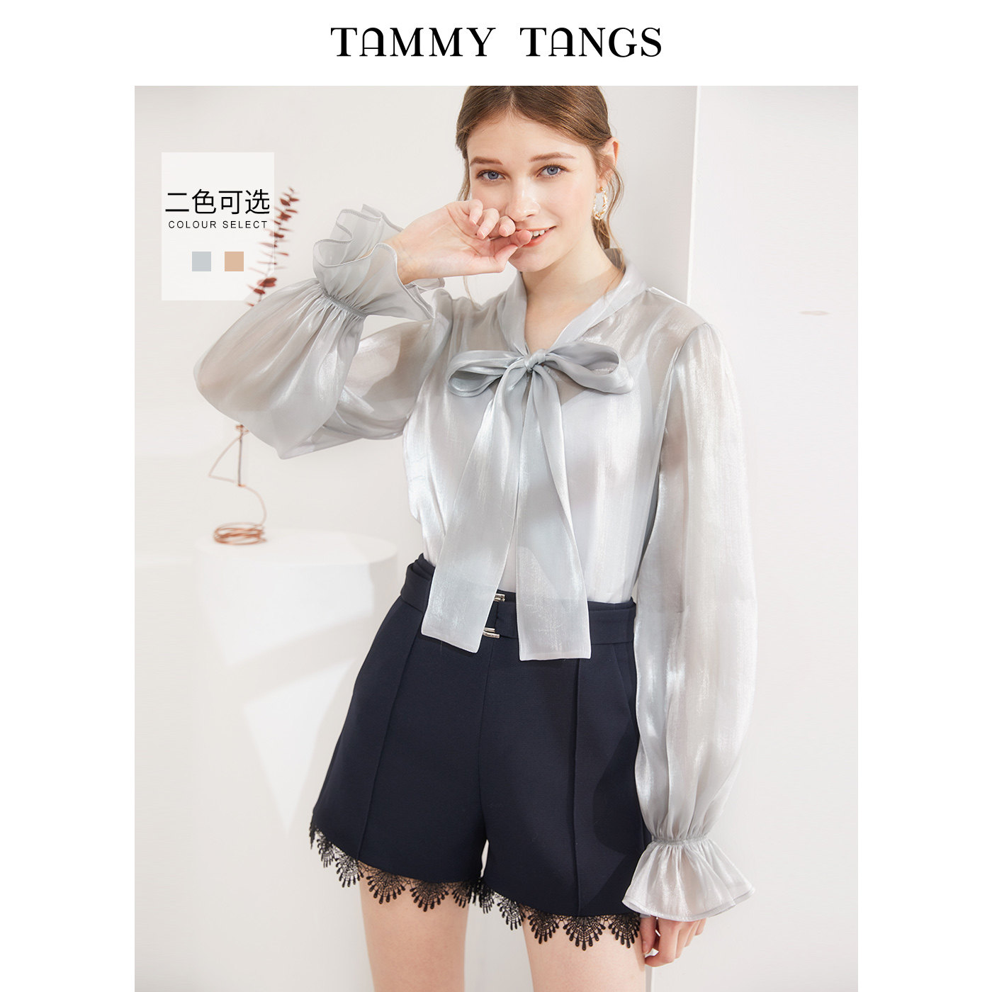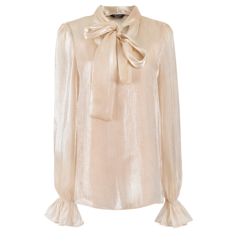 Sugar power Spring and Autumn new nude long sleeve loose bow lace-up shirt texture two-piece blouse women