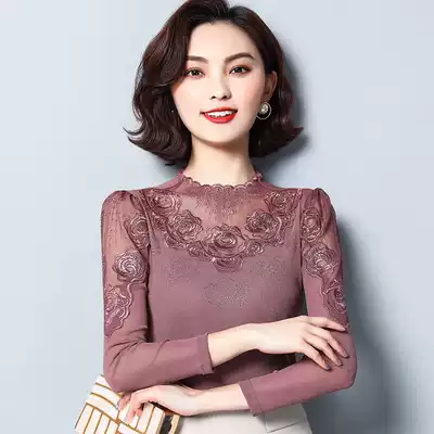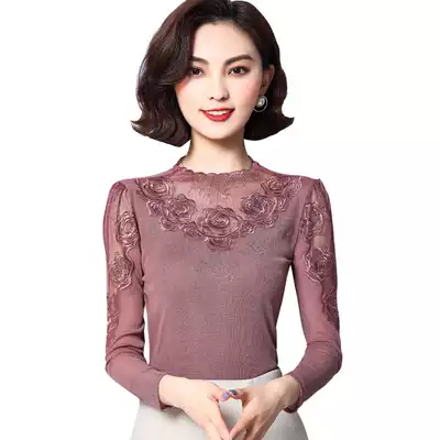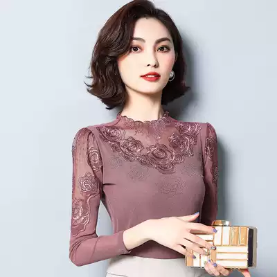 2021 New lace base shirt female spring and autumn with thin long-sleeved mesh top turtleneck Joker foreign pie shirt