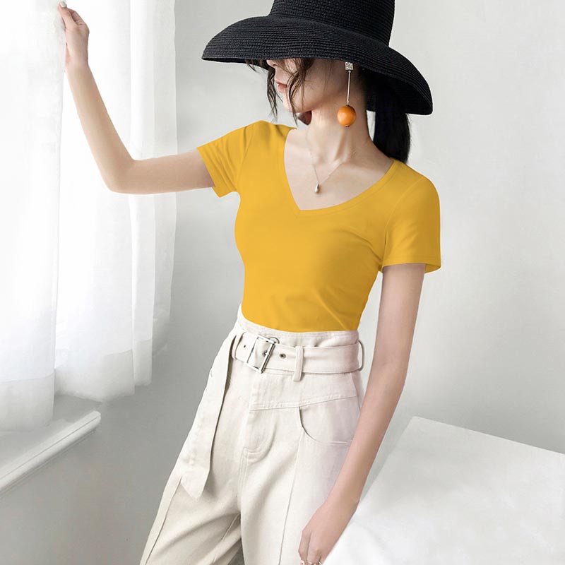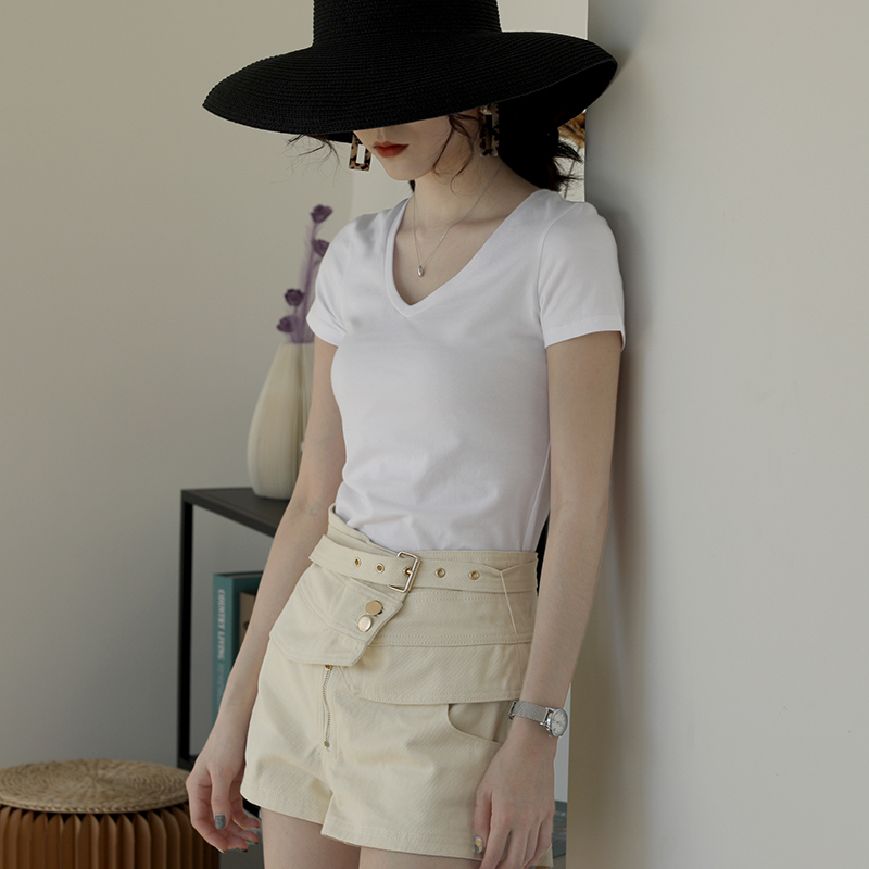 Summer red t-shirt women's v-neck short-sleeved bottoming shirt pure cotton solid color slim fit half-sleeved top 2021 new trend