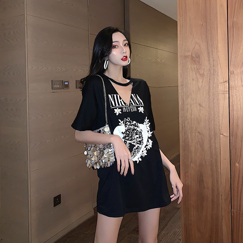 Short-sleeved T-shirt women's 2022 new women's loose bf Hong Kong style mid-length version hanging neck sexy V-neck top ins tide