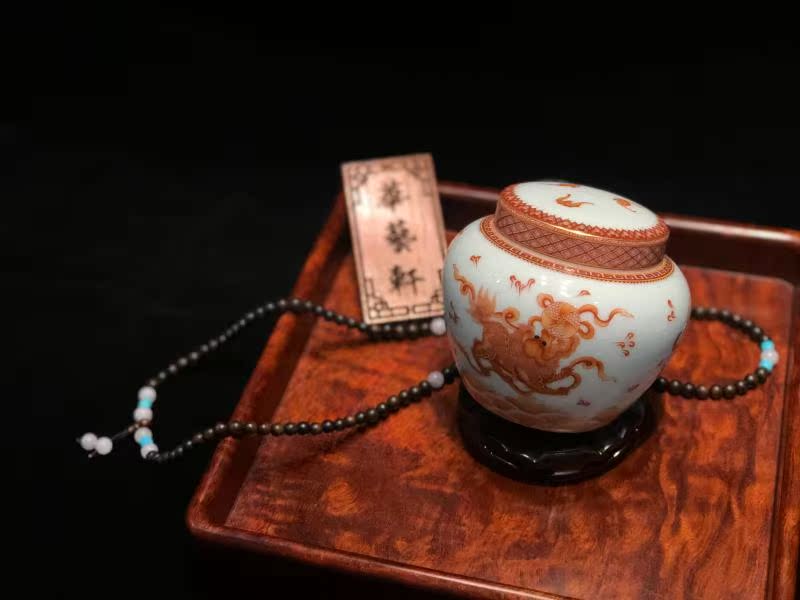 Jueyao kiln Yihai appreciation old alum Red Three Lions series tea set Bowl Tea Pot Pot washing, etc.