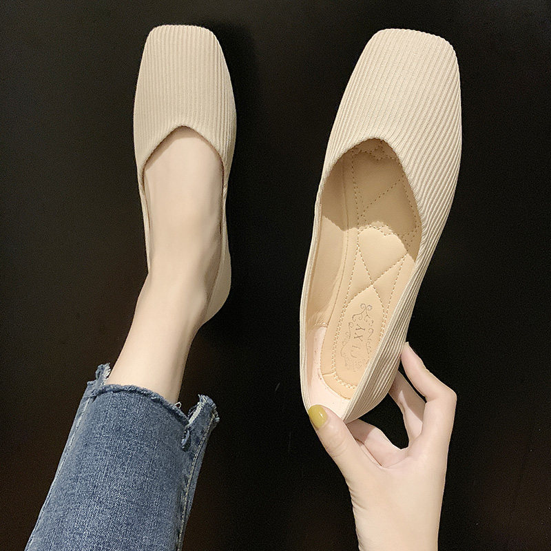 2022 Summer flat-bottom bean-bean shoes Women's new Korean version 100 lapped square head knitted grandma ladyshoe late night soft bottom single shoes