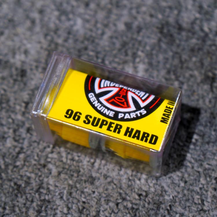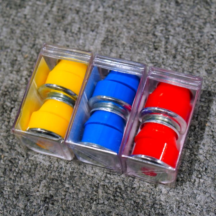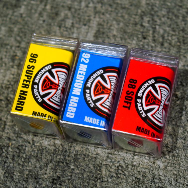 Yellow 96A (toughest) blue 92A (medium hardness) orange 90A (INDY original fit hardness) red 88A (medium partial soft) white 78A (most soft)